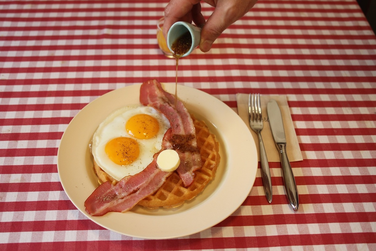 人気のモーニングメニューは「ベーコンエッグ」1150円。自家製ベーコンと目玉焼きがトッピングされていて、朝からがっつり食べたい方におすすめです。添えてあるメープルマスタードをかけることで甘くなりすぎず、最後までおいしくいただけます。