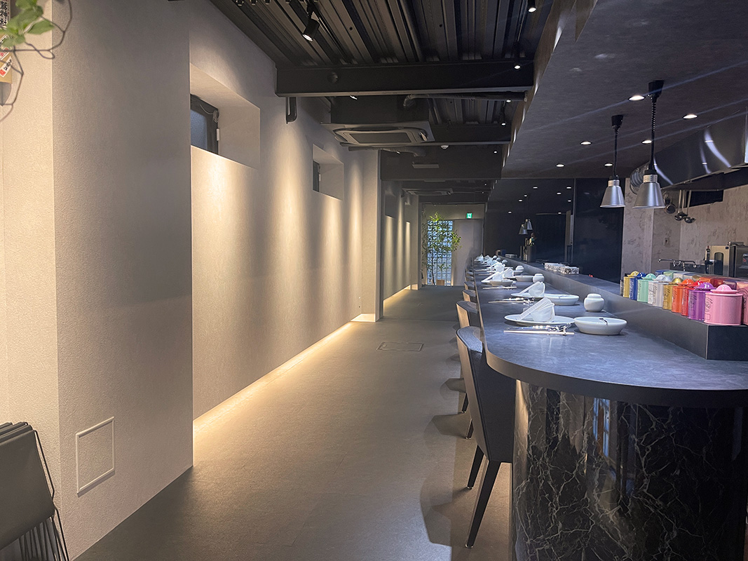 店内はモノトーンを基調としたシックな雰囲気。オレンジ色の間接照明が大人っぽいムードを醸し出しています。