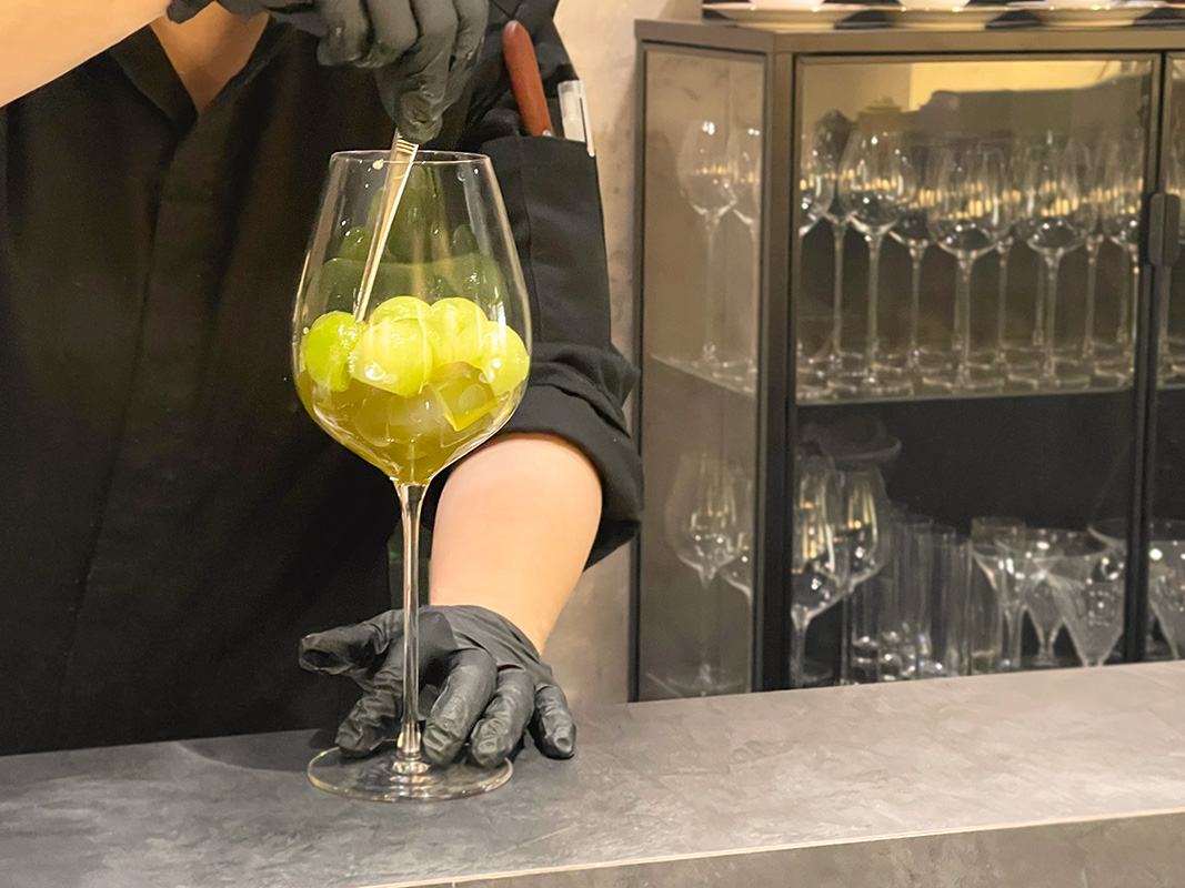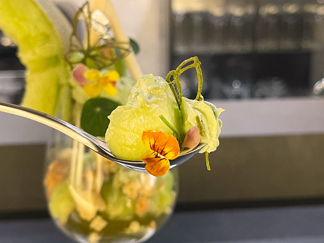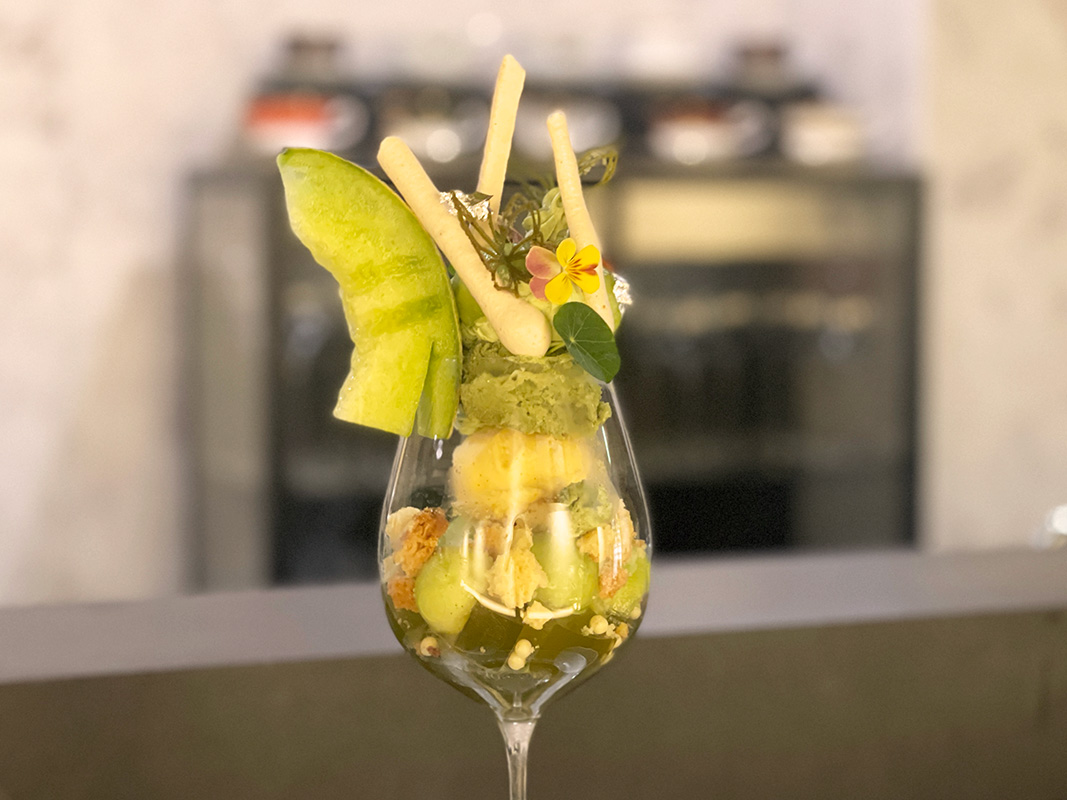 味の想像がつかなかった大葉のソルベは、ソルベ特有のシャリっとした口当たりと大葉の風味をしっかりと感じるさわやかな味わい。メロンやほかの具材との相性も抜群で、全体的にさっぱりと食べられます。
