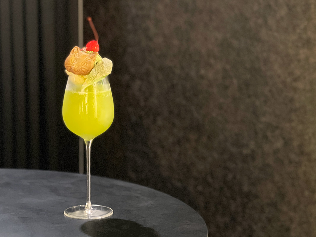 イバラキングのピューレに炭酸を合わせたメロンソーダに、バニラアイスとホイップクリーム、猫のクッキーとサクランボをトッピングしています。