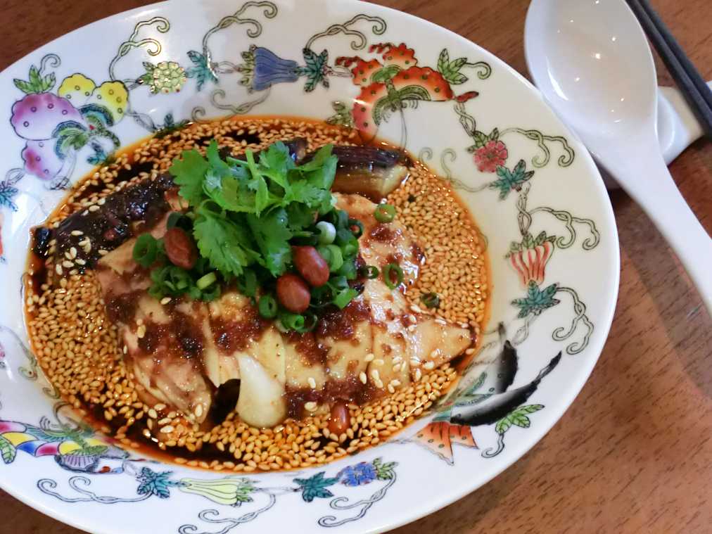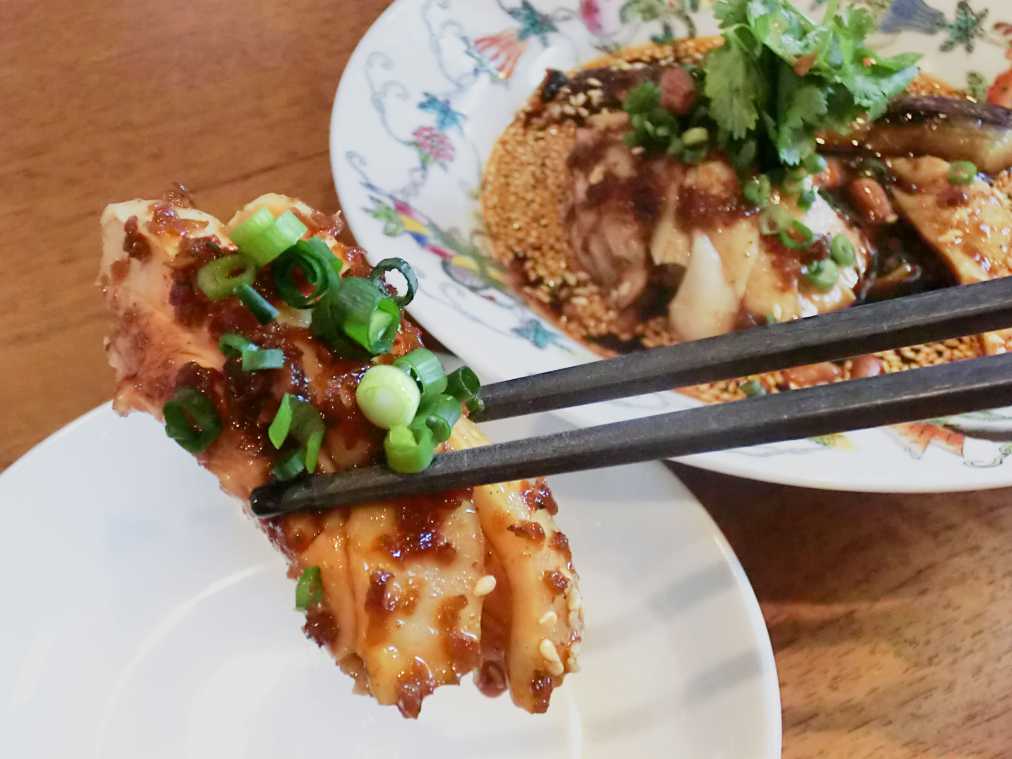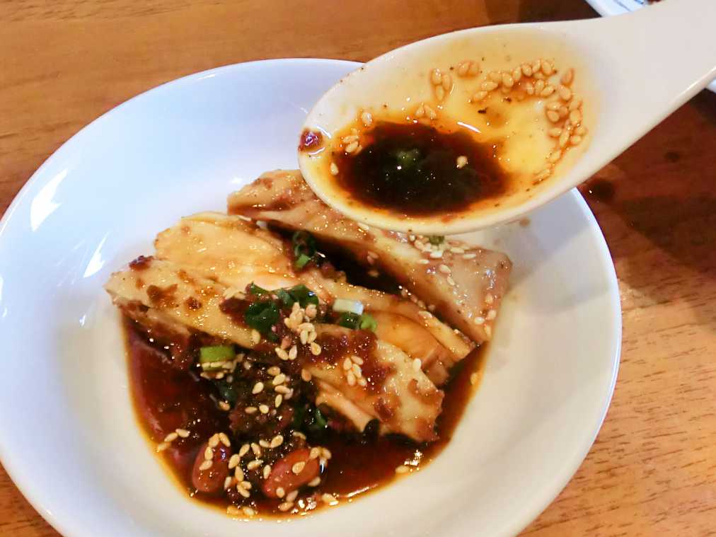 評判のタレをたっぷりかけてパクリ。ぶわっと広がる深い香ばしさのあと、鶏肉のみずみずしさに衝撃パンチ!タレはまろやかな甘酸っぱさと深いコクがあり、辛さも上品で食べやすい。いわゆる激辛で痺れまくる四川料理とは別次元の味です。
