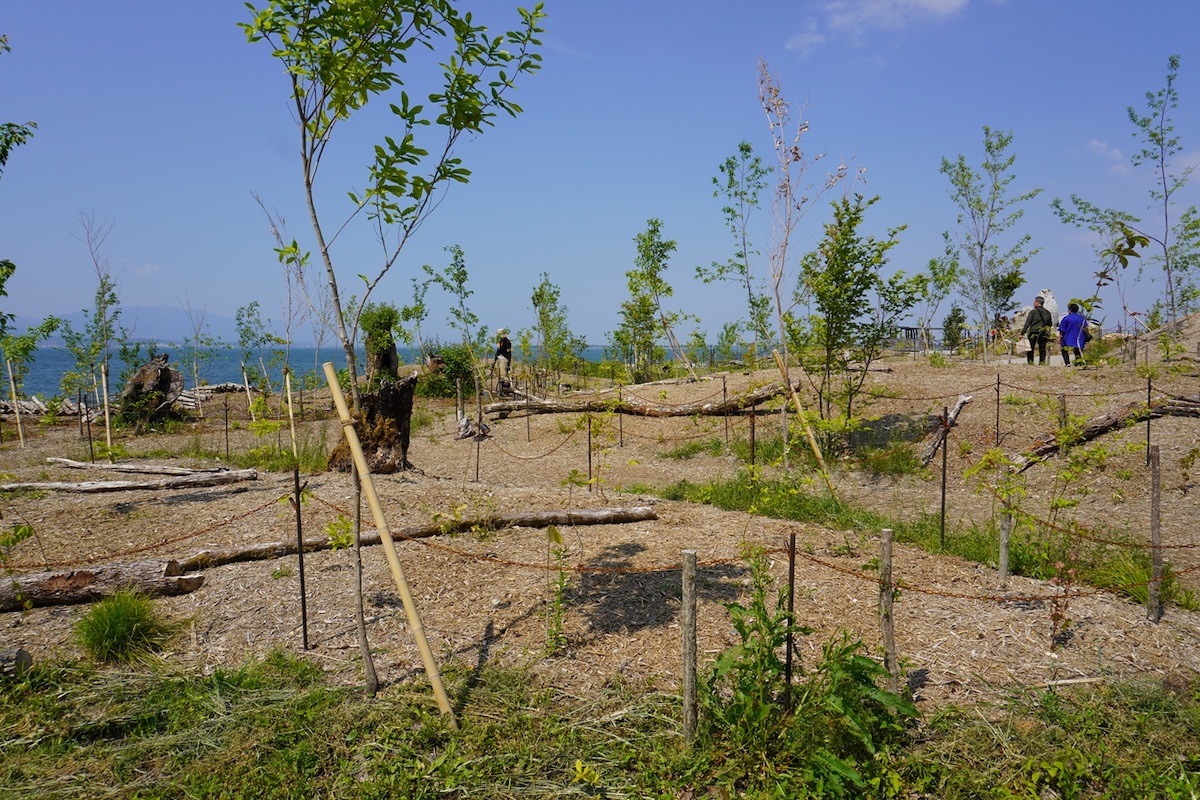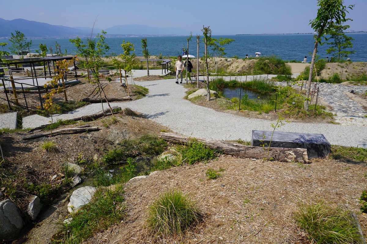 店舗の前に広がる「琵琶湖の森」。滋賀県在住の写真家で里山環境プロデューサーでもある今森光彦氏の監修で、琵琶湖とつながる里山を育てていこうと、オープンに合わせ約100種類、4000本の木々が植えられました。苗木が成長し、10年20年と時を重ねて、これからどんどん豊かな森に育っていく姿を見守るのも、訪れる楽しみになりそうです。
