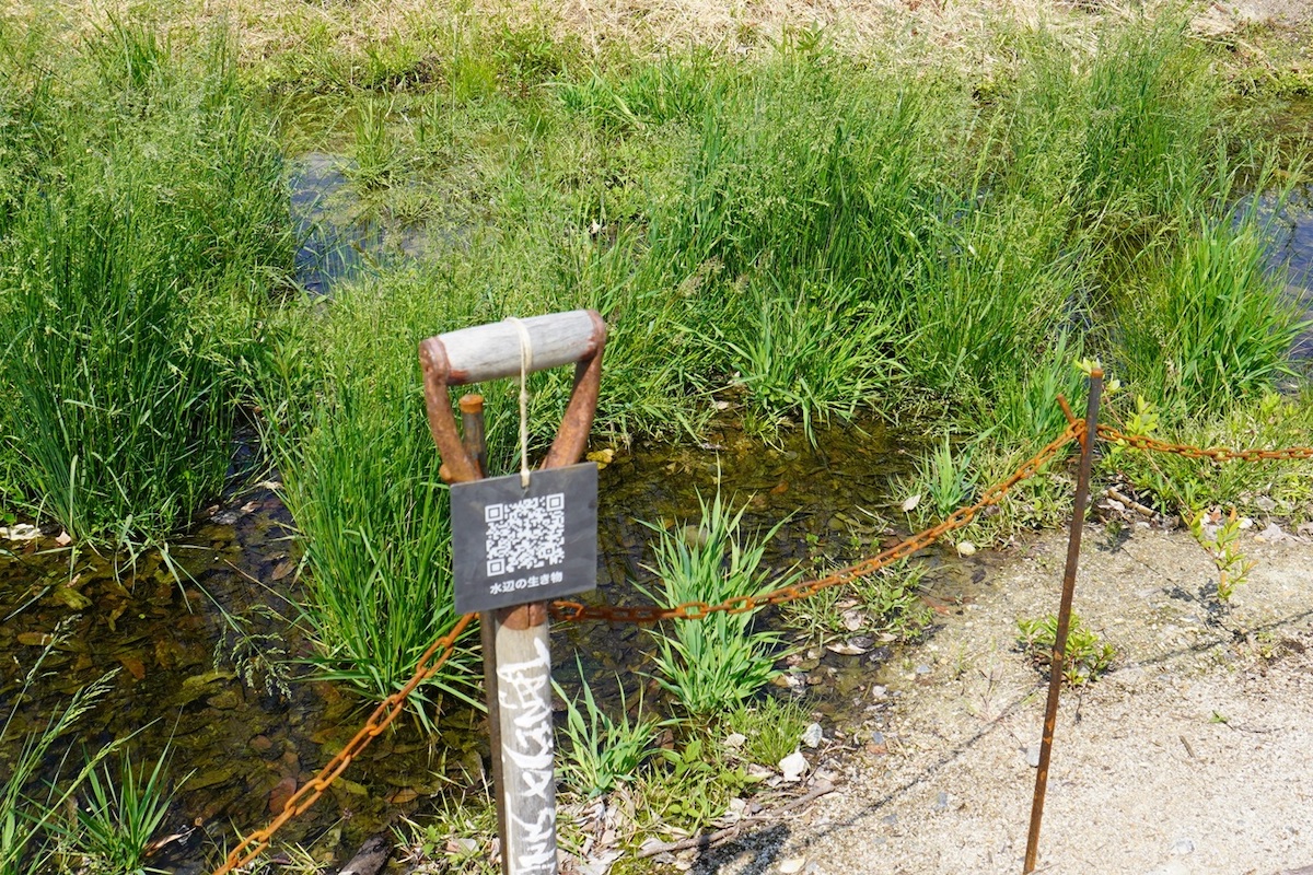 琵琶湖の森のみどころの近くには、二次元バーコードを備えた看板が設置されています。こちらの看板には、「水辺の生き物」についての説明が。