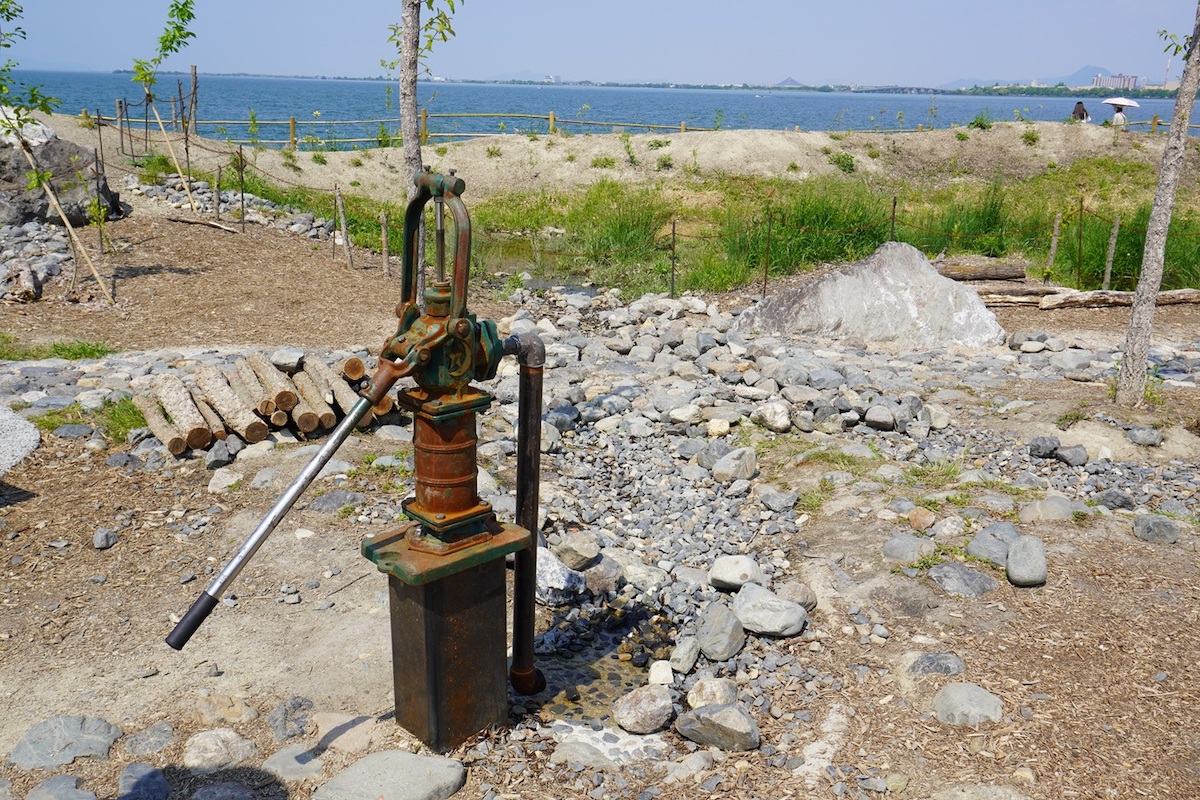 昔懐かしい、水をくみ上げる手押しポンプもあります。棒状のレバーを上下させると、勢いよく水が流れ出て、子どもたちは大喜び。大人も思わず動かしたくなりますね。
