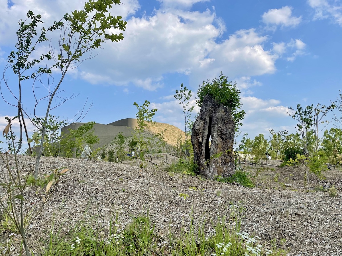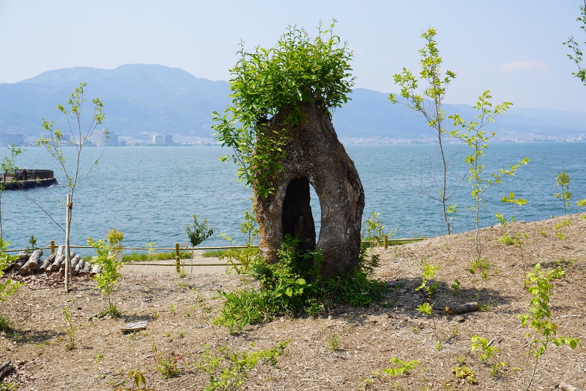 こちらは琵琶湖の森のシンボル「やまおやじ」。高島市マキノ町の雑木林から譲り受けた、こぶや穴のあいた姿が印象的なクヌギの古木です。移植当初はごつごつとした木肌だけのように見えたのが、葉っぱが出てきて刻々と様子が変わっているそう。見つめていると、何かを語り始めそうな不思議な力と命を感じます。