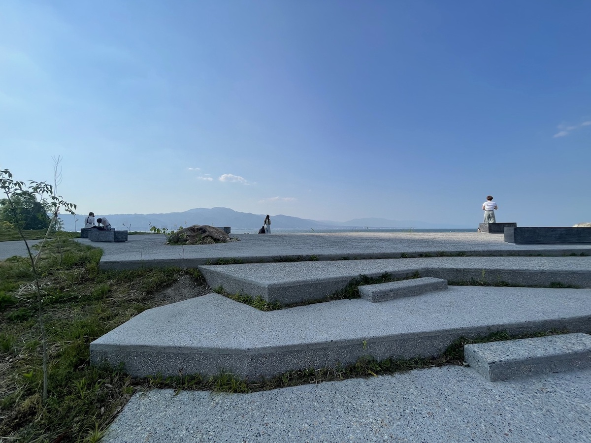 店舗の外にはあちこちにベンチが設けられていて、大パノラマの琵琶湖を眺めることができます。店名のLAGOはイタリア語で「湖」という意味。琵琶湖の豊かさ、尊さを守り伝えていきたいという思いを込め、水と自然、食や人、文化にふれられる場所を目指しています。