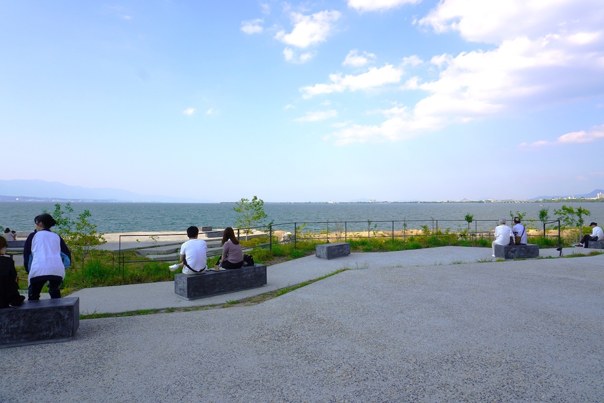 湖岸に近いテラスは、キラキラとたゆたう琵琶湖、湖上の船や水鳥を眺められる特等席です。湖からの風を感じながら、カフェでテイクアウトしたメニューをこちらで楽しむのもおすすめです。