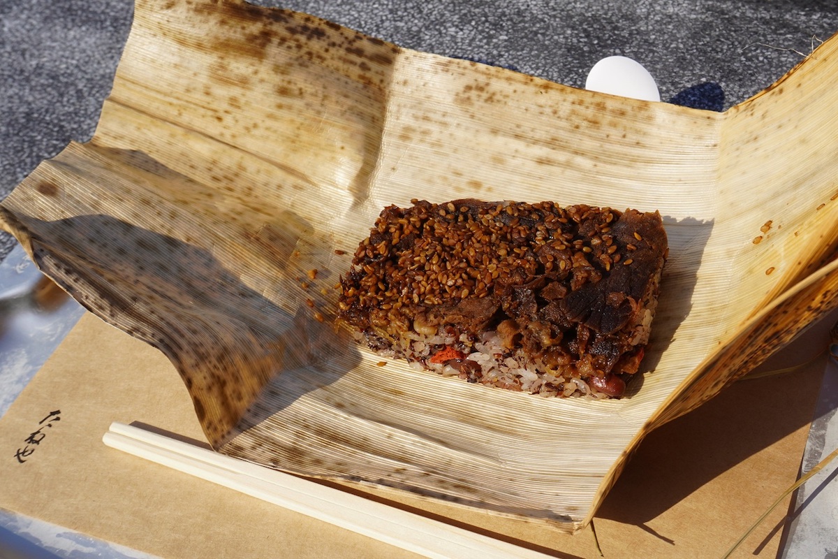 軽いランチにおすすめの「おこわ近江牛」。竹皮の包みを開けると、砂糖としょう油で味付けされた近江牛をのせた贅沢なおこわが! ほかに「近江おこわ」550円、「おこわ近江軍鶏」1430円もあります。