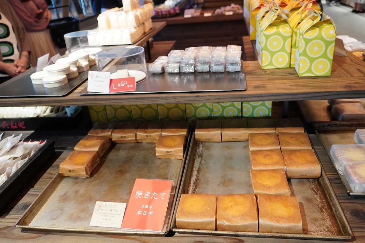 ふわふわ食感が人気の看板商品「焼きたてたねやカステラ瀬戸内レモン」825円はLAGO大津限定。レモンの皮のすりおろしと角切りのレモンが生地に加えられていて、口に入れた瞬間さわやかなレモンの風味と香りが感じられる逸品です。「焼きたてたねやカステラ」は季節ごとにフレーバーが変わる季節限定商品なので、何度も訪れたくなりますね。