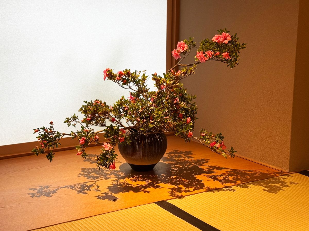 和室の奥には生け花が飾られていて、日本の伝統文化や、自然の美しさを感じることができます。こちらの生け花は、外の光と室内の照明から生まれる影も意識して生けられているのだとか。