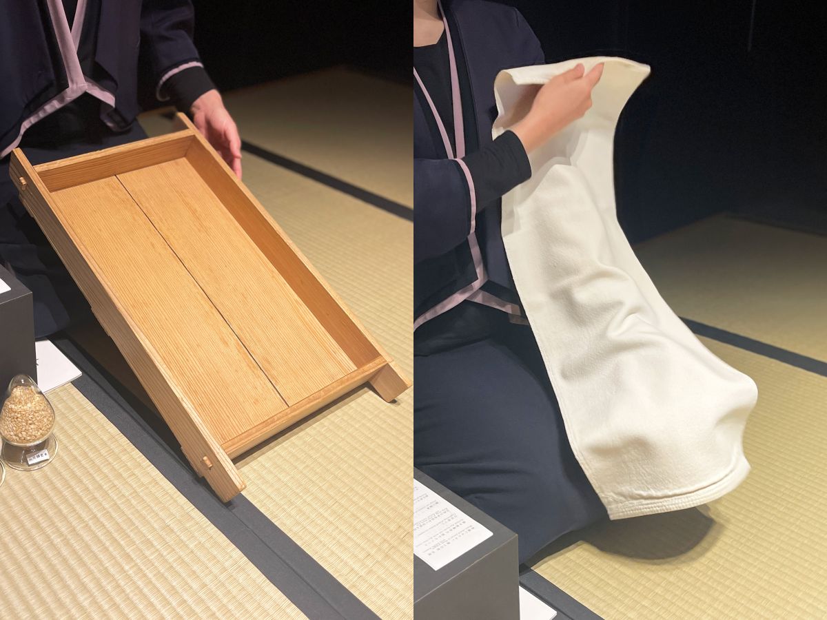 外観は洗練されたたたずまいとなっており、のれんをくぐって中へ入ると「長谷川栄雅」の世界観を感じられるギャラリーが。壁のスクリーンには「長谷川栄雅」が生まれた姫路の風景や、麹作りの工程が映し出されています。また、陶芸家が制作した酒器や、新時代の和装をコンセプトにしたアパレルブランド「sowaha(そわは)」のアイテムなども販売しています。