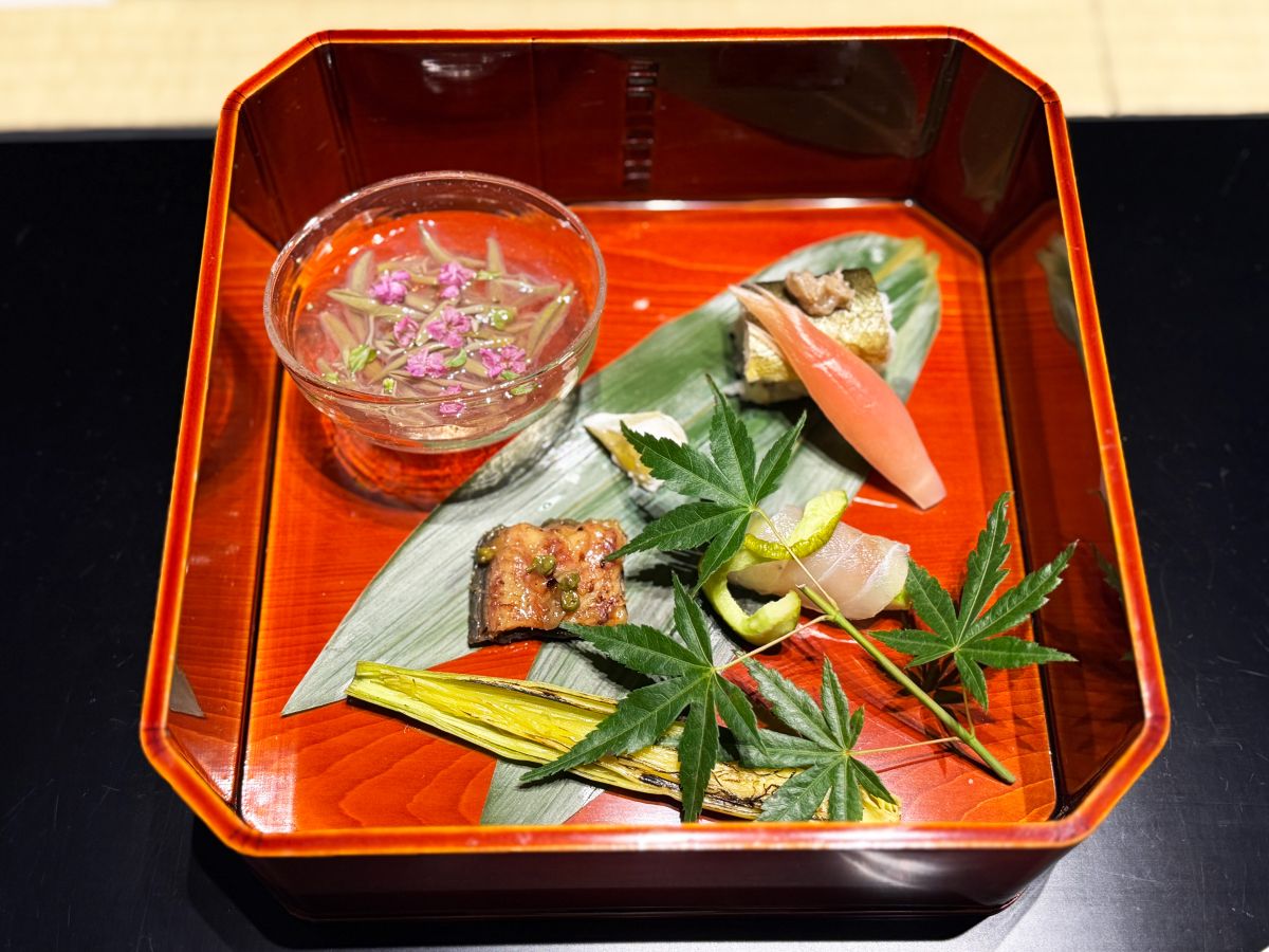 酒の肴は手がけるシェフが3カ月ごとに異なり、取材時は「銀座和郷(ぎんざわきょう)」の料理長・小澤さんが担当。「栄雅」の2種どちらともペアリングを楽しめる肴として出てきたのは、会席料理のコースなどで提供される「八寸」をイメージしたひと皿。夏の食材を使用したオリジナルメニューを味わえました。
