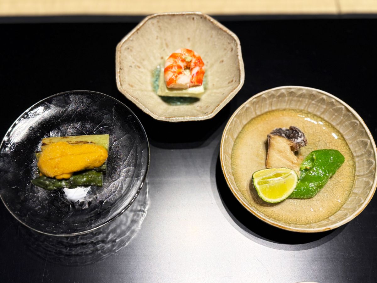 「長谷川」3種の肴は、それぞれのお酒に合う3品が登場。質のよい食材を生かし、日本酒と食事を交互に楽しむことを想定して考案されています。