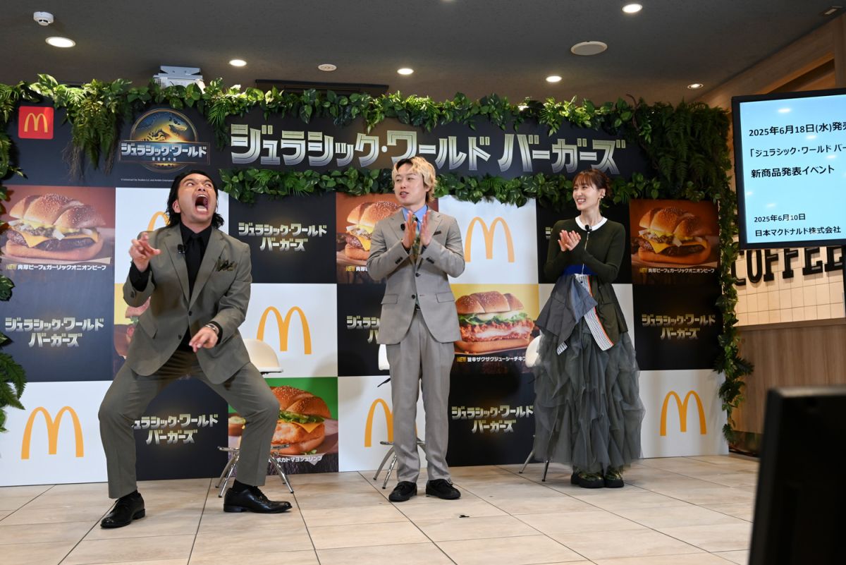 ちなみに、「ジュラシック・ワールド バーガーズ」新商品発表イベントでは、お笑い芸人の見取り図の2人、欅坂46・櫻坂46の元メンバーで女優の菅井友香さんが登場。それぞれの商品の試食はもちろん、『ジュラシック・ワールド』にちなんで、3人が恐竜のモノマネを披露するなど、笑いの絶えない発表会となりました。