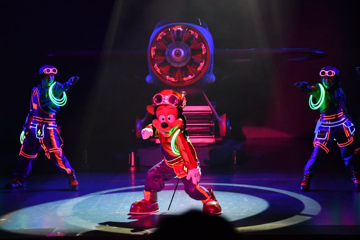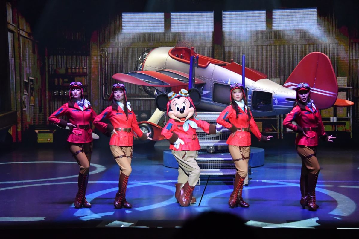 まずはミッキーと工場長のピートが登場。ダンサーと一緒に華やかなオープニングナンバーを披露し、飛行機工場の1日が始まります。
