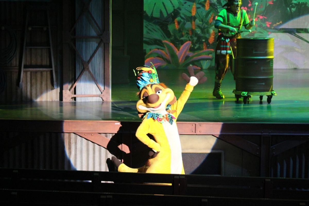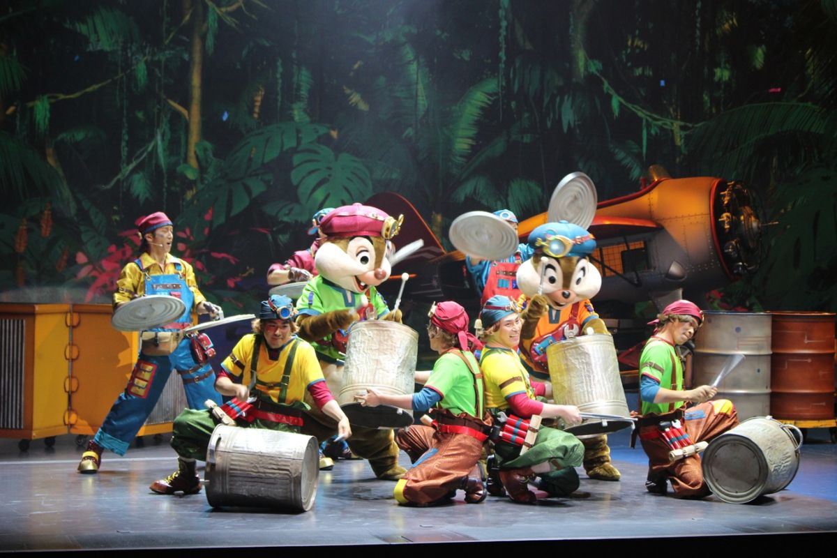 道具調達係のチップとデールのシーンでは、大きなバケツやドラム缶がステージに登場。飛行機工場ならではの道具を使った音で、楽しいリズムを奏でます。さらに『ライオン・キング』のティモンやダンサーたちも客席に下りてきて、ボディーパーカッションでゲストを盛り上げます。ぜひ手拍子でショーに参加してみて!