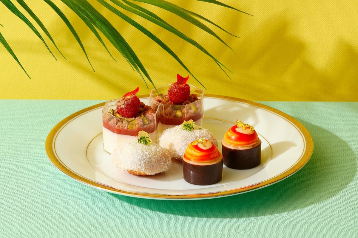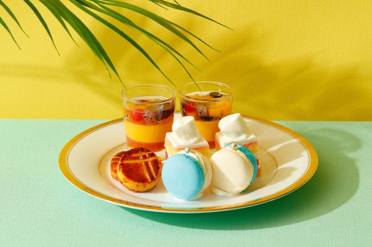 スイーツには、マンゴーやドラゴンフルーツを使用した「トロピカルフルーツポンチ」や、真っ赤なマーブル模様が美しい「赤肉メロンムースとショコラパッション」、ブルーのヨーグルト味と真っ白なバニラ味が印象的な「ソルティライチマカロン」が並びます。そのほかにも「ピンクグレープフルーツのショートケーキ」、「ココパインケーキ」など、色鮮やかなティーフーズがスタンドを彩ります。