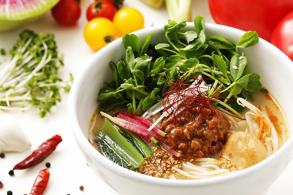 スープは白練りゴマとピーナッツでコクを出し、そぼろ肉はなんと!大豆ミートで再現しています。大豆であることが信じられないお肉のような味や食感に、思わず動物性食品を使っていないということを忘れてしまうほど。濃厚でコクのある旨味が口に広がる金胡麻が薫る一品です。