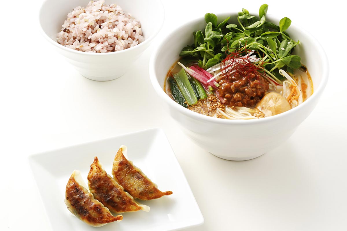 らーめんだけではなく、大豆ミートを使用した「全部野菜の焼き餃子 3個」(350円)など、脂質を抑えつつ高たんぱくなカラダにうれしいメニューもあります。らーめんとセットで頼めば大満足!でも重くなくて本当においしい!
