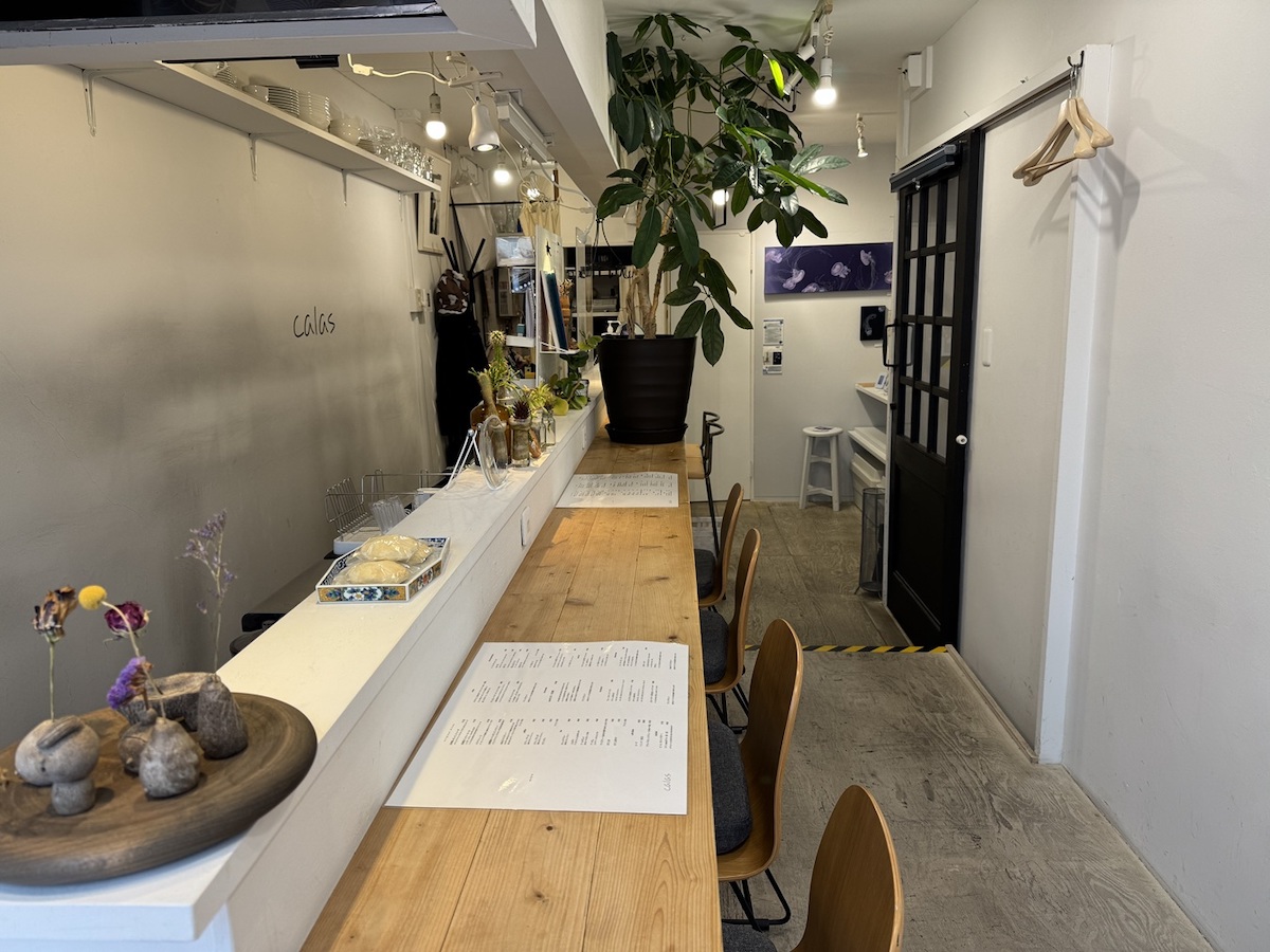 店内は白を基調にしたオシャレな空間で、ところどころに飾られている観葉植物の緑に癒やされます。座席はすべてカウンター席で、L字のような配置。「来店したお客さまにはゆっくりしてほしい」との思いから、店主の趣味を主張しすぎないよう、食器など全体的に白で統一しているそうです。