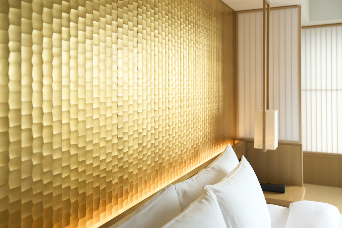 金箔が美しいベッドボードは、手斧(ちょうな)で殴るように削る名栗(なぐり)という伝統的な加工技術が施されています。照明を落とすとやさしく光る金箔がとても素敵……。客室内にも、随所に日本の伝統を感じる要素が散りばめられています。