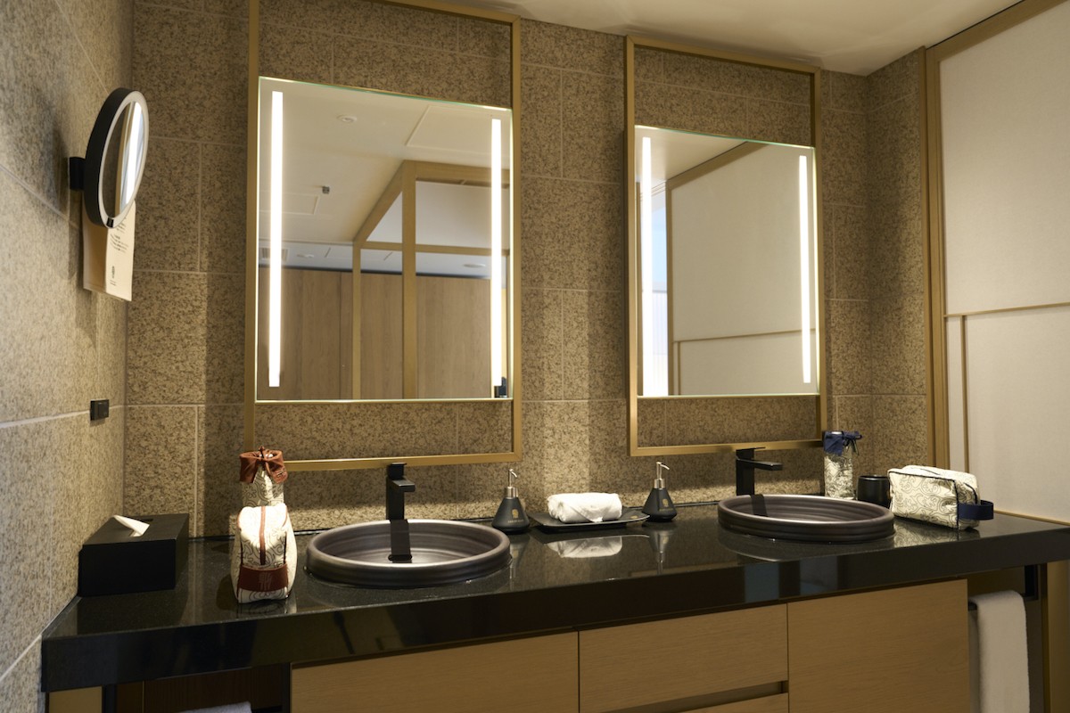 洗面台はダブルシンクなので、二人で宿泊しても朝の支度や夜のバスタイムなど、安心してゆっくり使えるのがうれしい。