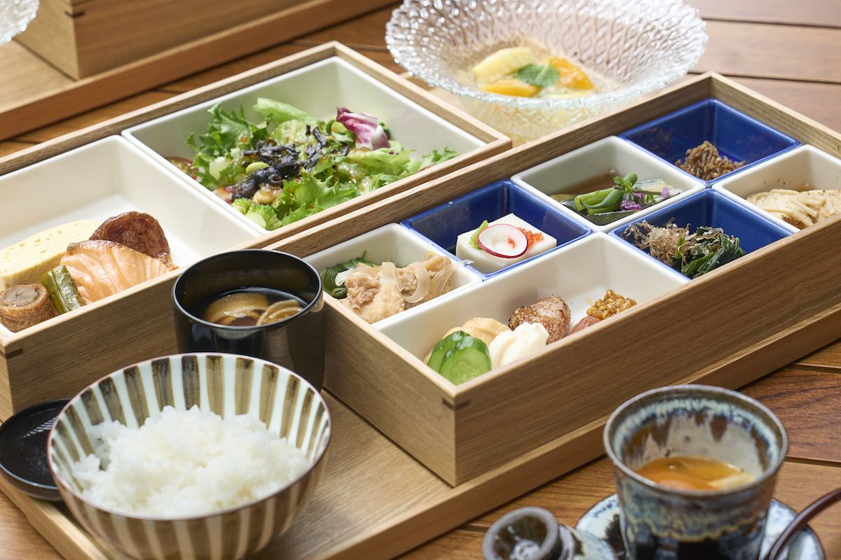 お待ちかねの朝食はこちら。桐箱の中には、一晩味噌に漬けた「サーモン味噌漬け」、だしの味がやさしく広がる「出汁巻き」、「グリーンサラダ しば漬けドレッシング」など、こだわりの食材を使用したおかずが美しく盛り付けられています。