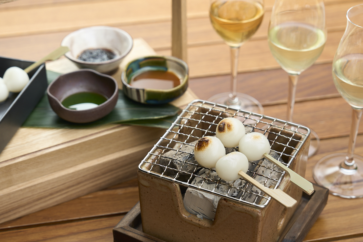「抹茶のアフタヌーンティー」では「七輪で焼くミニ団子」が新登場! ひとりひとり専用の七輪で団子を焼き、3種の特製醤油(抹茶・海苔・雲丹)とともにいただきます。