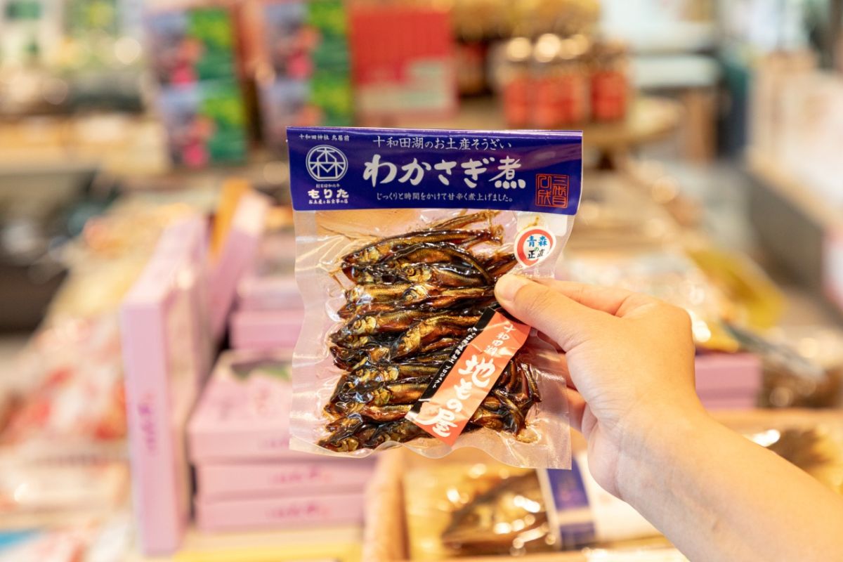 なかでもおすすめは、オリジナル商品にもなっている「わかさぎ煮」700円。わかさぎもひめますと同じく、十和田湖の特産品となっています。こちらの商品は醤油、砂糖のみで味付けをした甘露煮で、素材の味をしっかりと味わうことができます。お食事の後のお土産探しも楽しみの一つ!