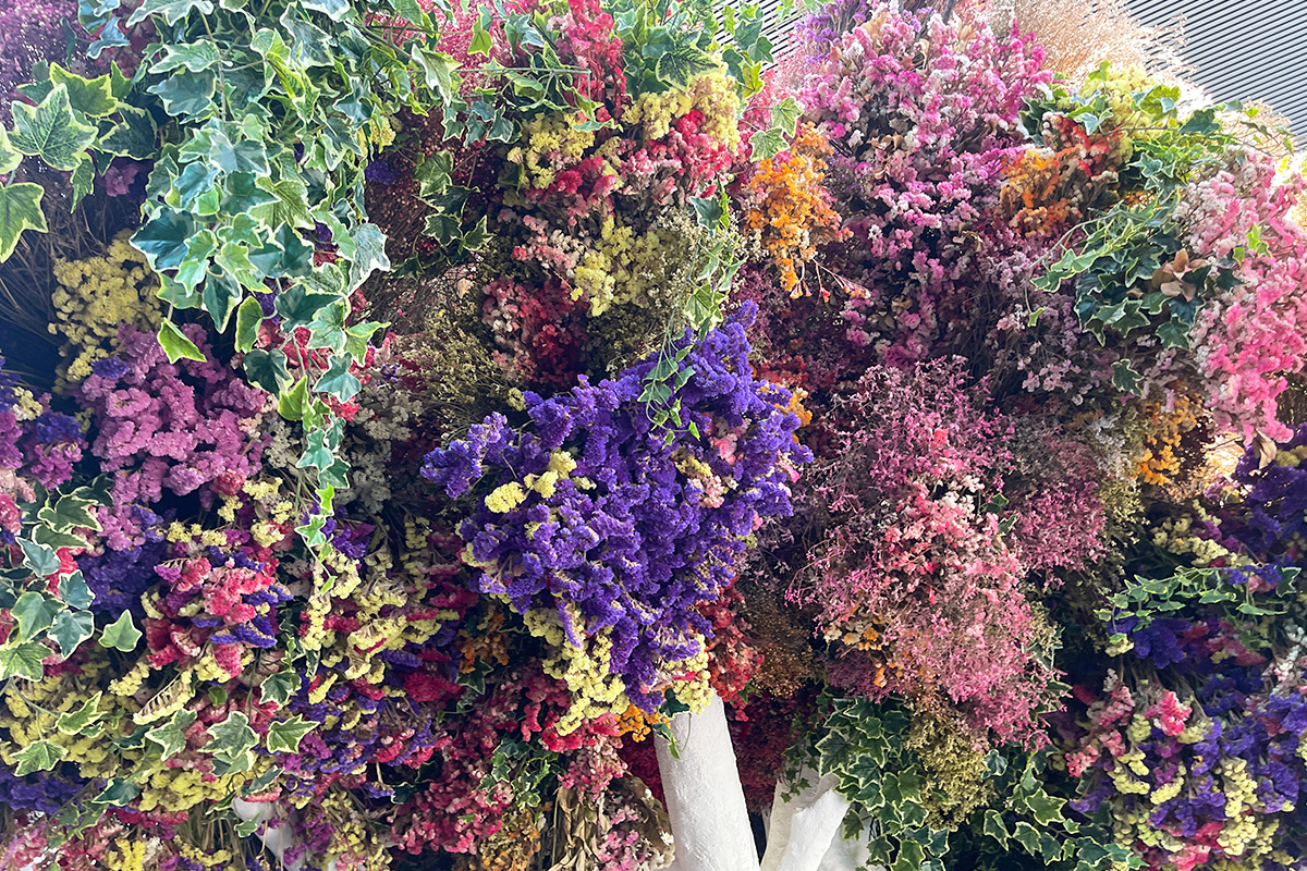 隙間無く咲き誇るドライフラワーは見る角度によって表情が異なり、ずっと眺めていたくなるほど美しい作品でした。