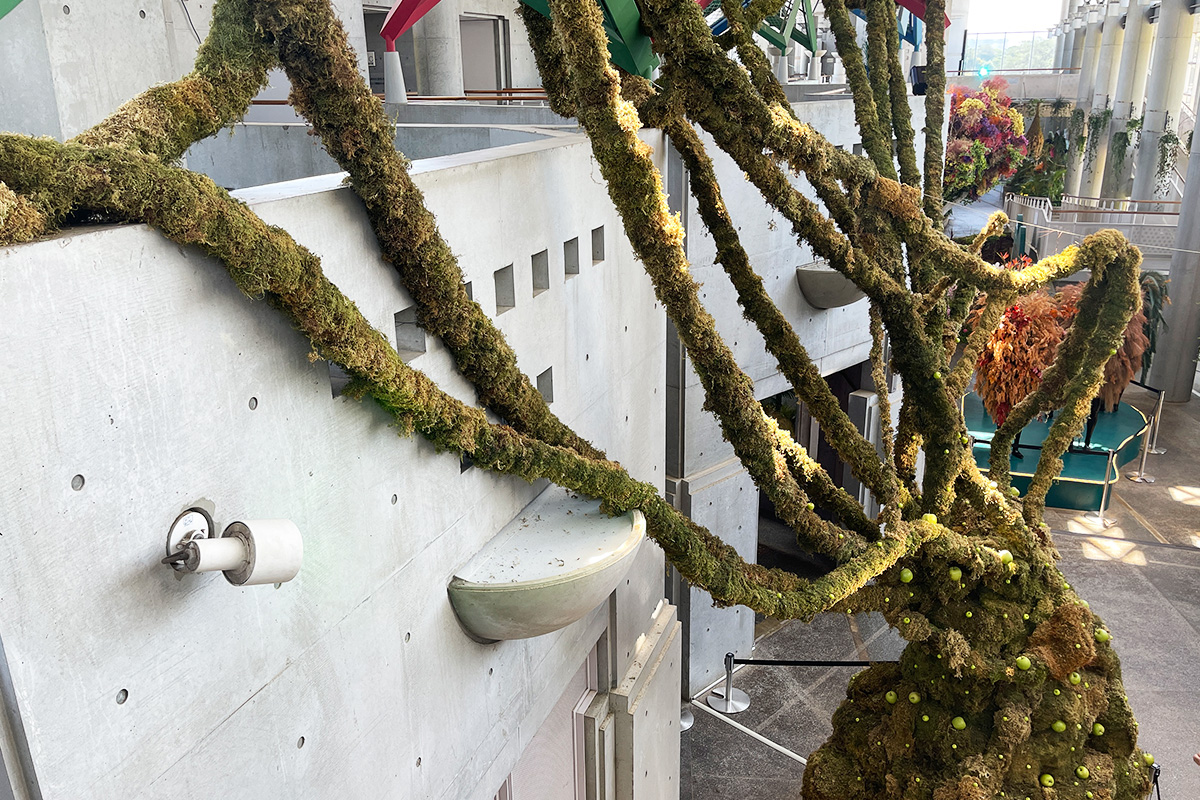 『MOSS MOSS(もす もす)』は、自然環境の維持における苔の重要性を地球の血管として表現した作品です。高さは約6メートルに及び、苔がコンクリートの壁を掴んでいるような迫力があり、展示物のなかでも圧倒的な存在感を放っています。