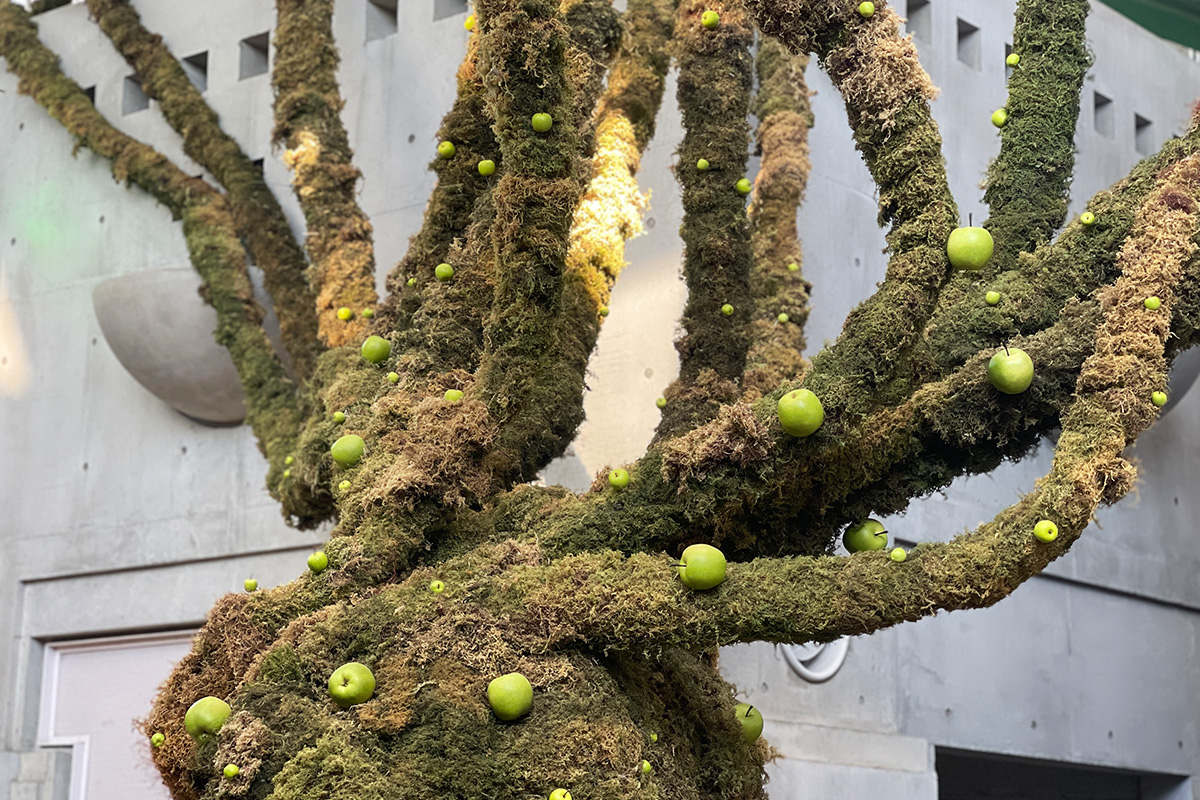 苔の上には、まるで実のように「BOTANICA MUSEUM」を象徴する大小の青リンゴが並んでいます。