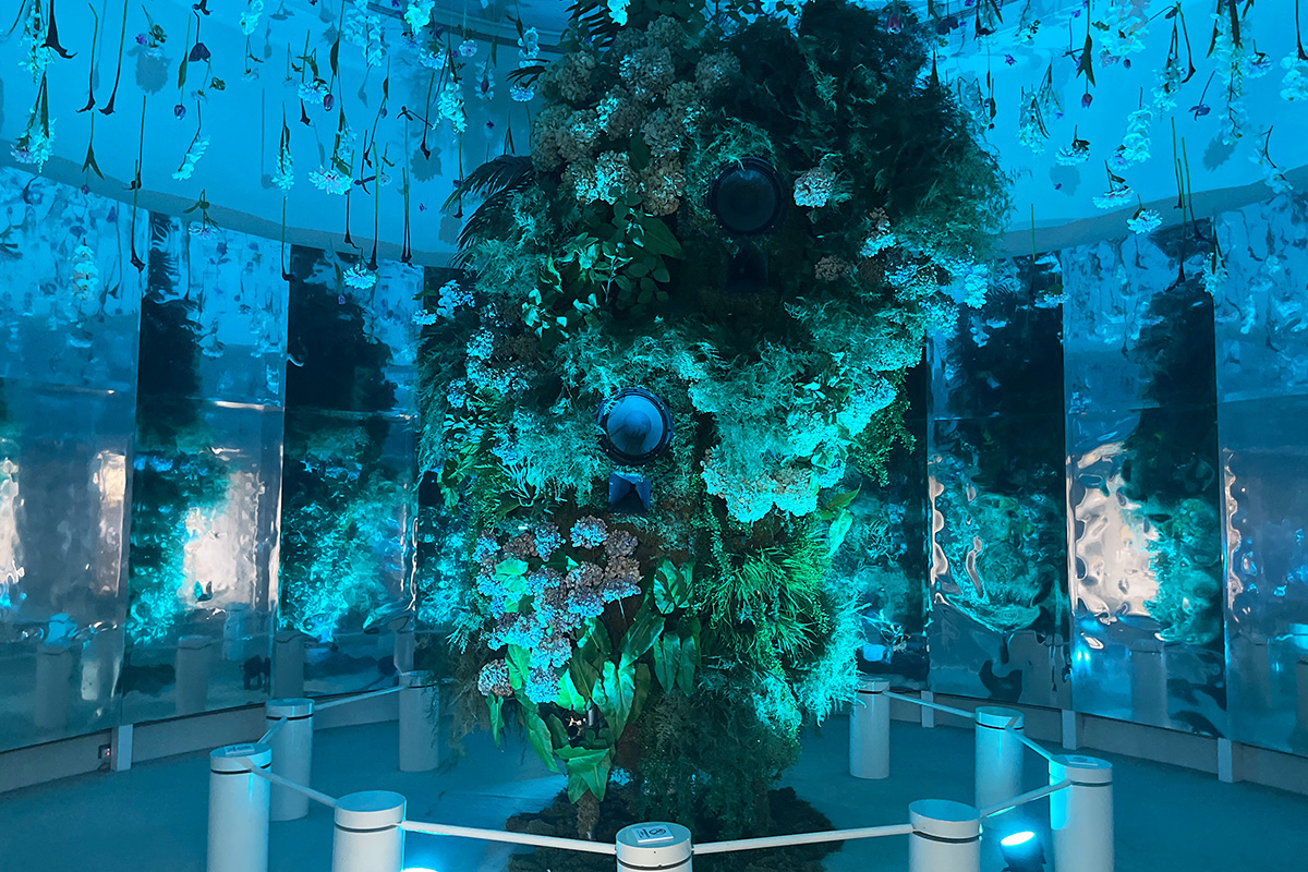鏡張りで異空間な雰囲気が漂う部屋の中央には、植物や花で作られた木のように大きいオブジェがあり、ブルーライトに照らされていて幻想的。部屋の中では、癒やしの周波数として知られている528Hzの風が木々を揺らす音が響き、所々にピアノや現代的な電子音が混ざり合って聴覚を刺激します。