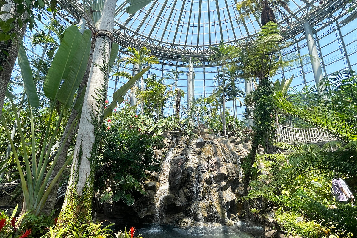 歴史が詰まったリニューアル前の内装をあえてそのまま残したというボタニカリウム。中央に人工滝があり水の流れる音とともに、まるで南国に旅行へ来たような気分で熱帯植物の鑑賞が楽しめます。