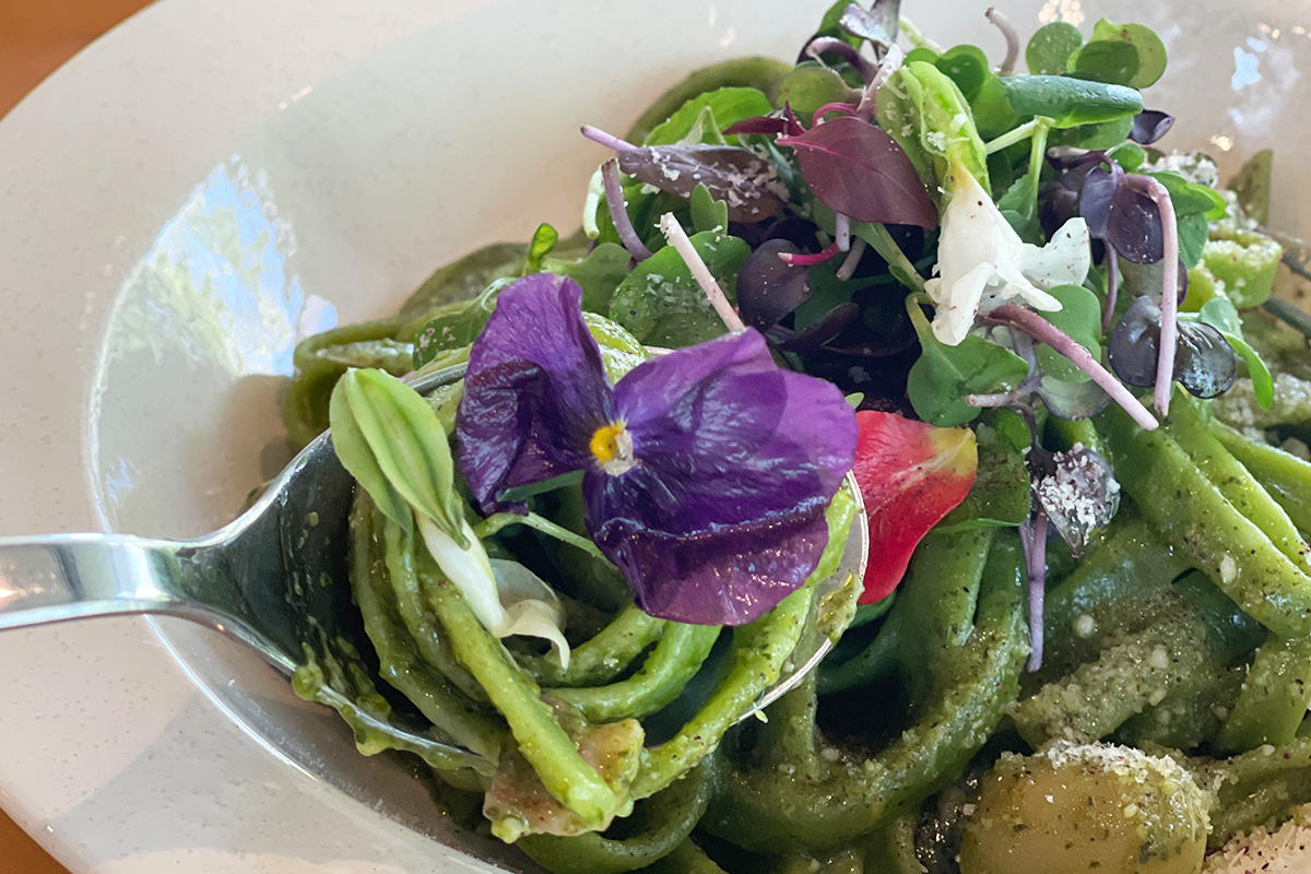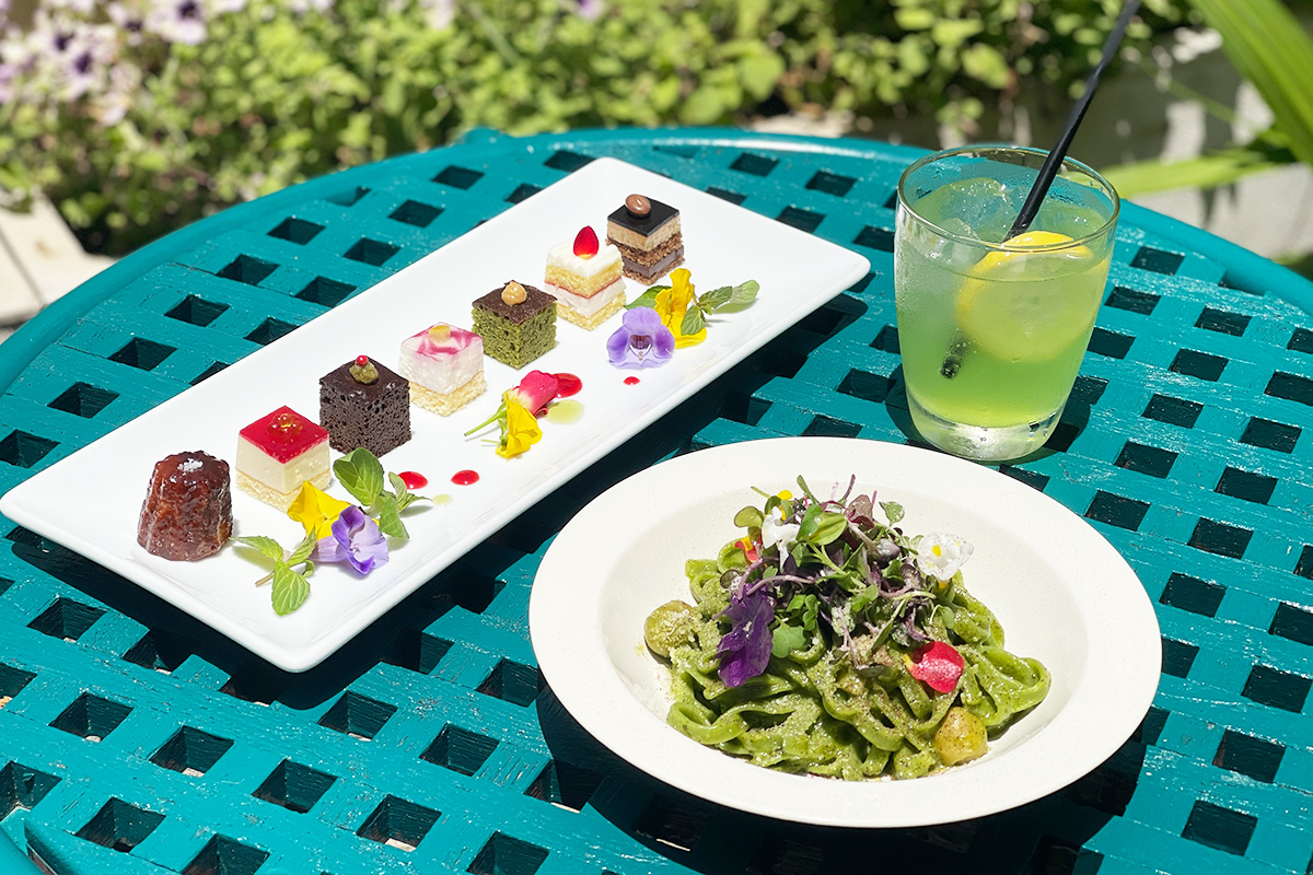 ます最初にご紹介するのは、パスタの上にエディブルフラワー(食用花)をあしらった華やかな「フラワーガーデンパスタ」。味はジェノベーゼ、トマトの2種類から選べて、今回はジェノベーゼをいただきました。