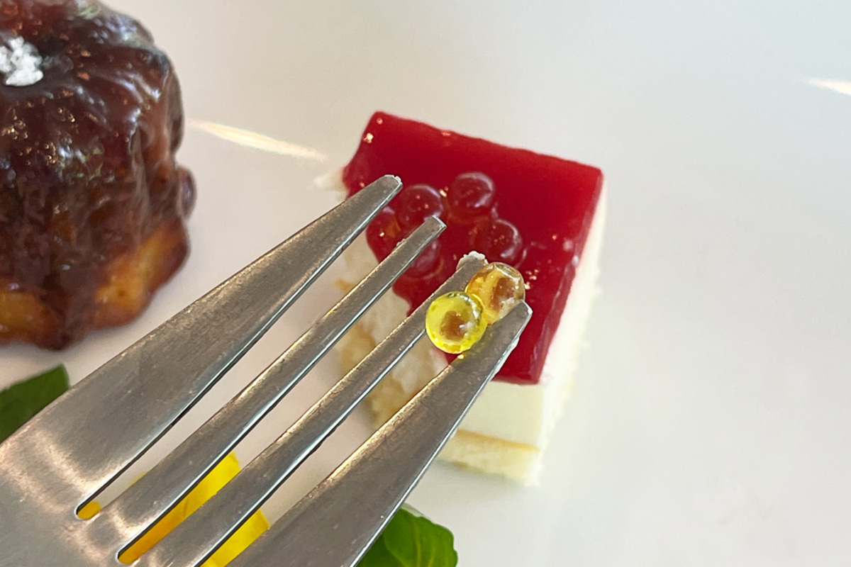 一見、イクラを黄色くしたような粒状のトッピングはなんとオリーブオイル。噛むとプチッと弾けてオリーブオイルの豊かな香りがじわっと口の中に広がります。ケーキがより濃厚に感じ、ぜいたく感が増すような感覚になりました。
