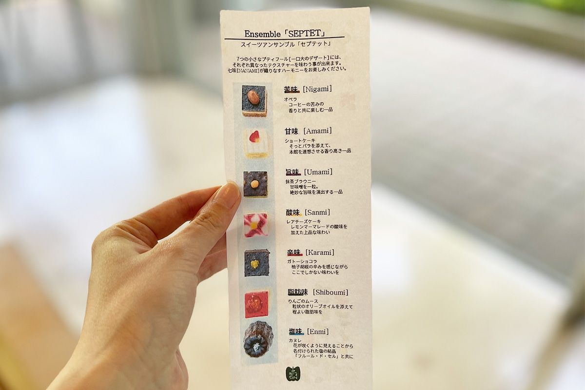 「スイーツアンサンブル セプテット 〜7つの小さなギフト〜」には、それぞれの味の特徴を記載した説明シートがついてきます。
