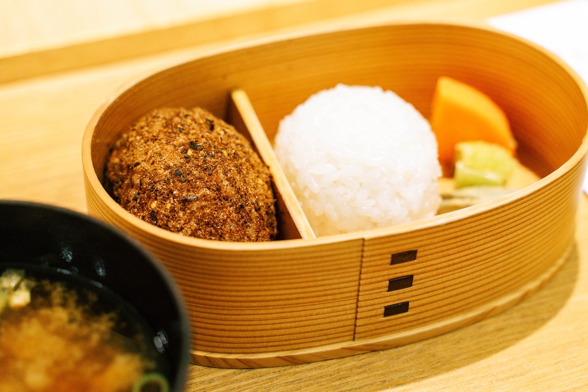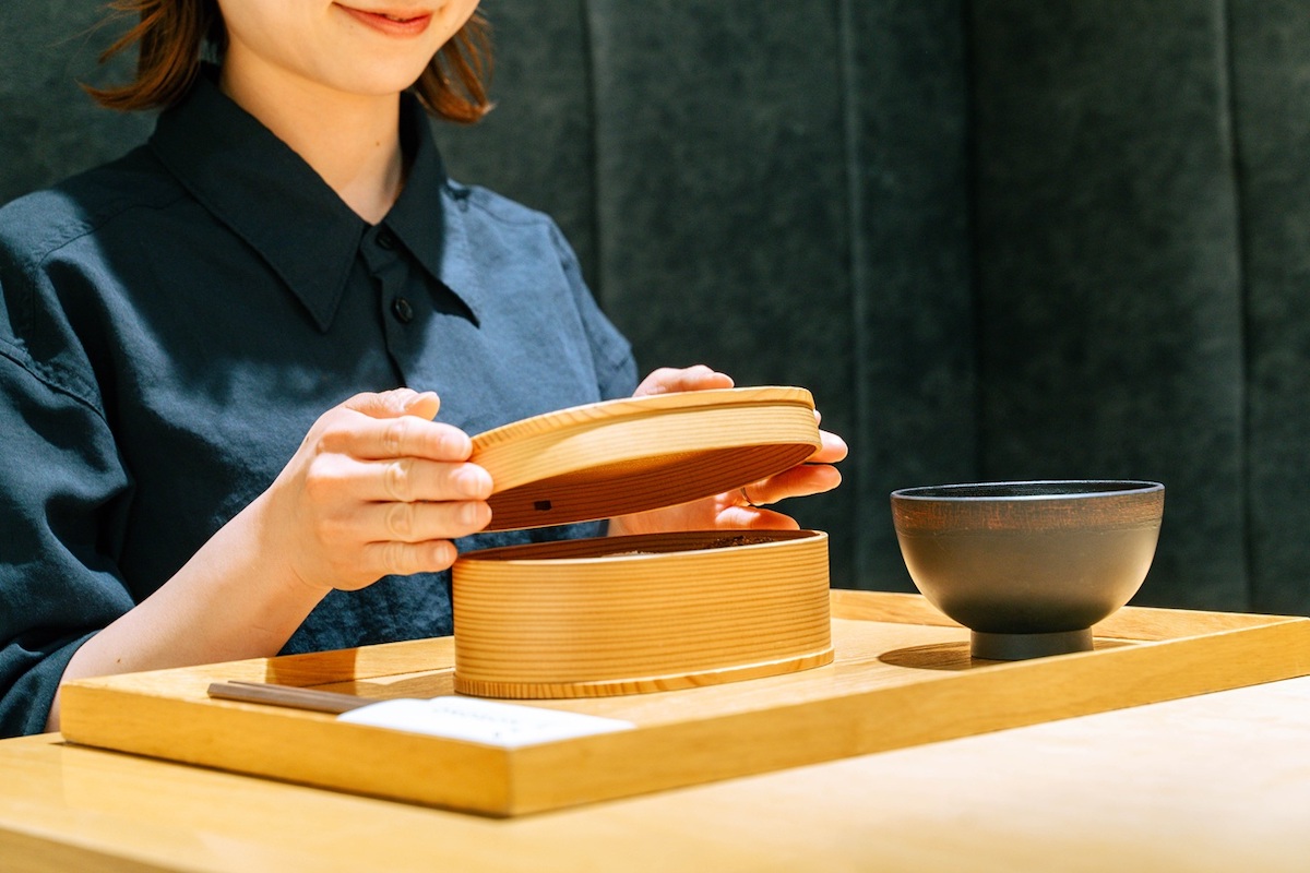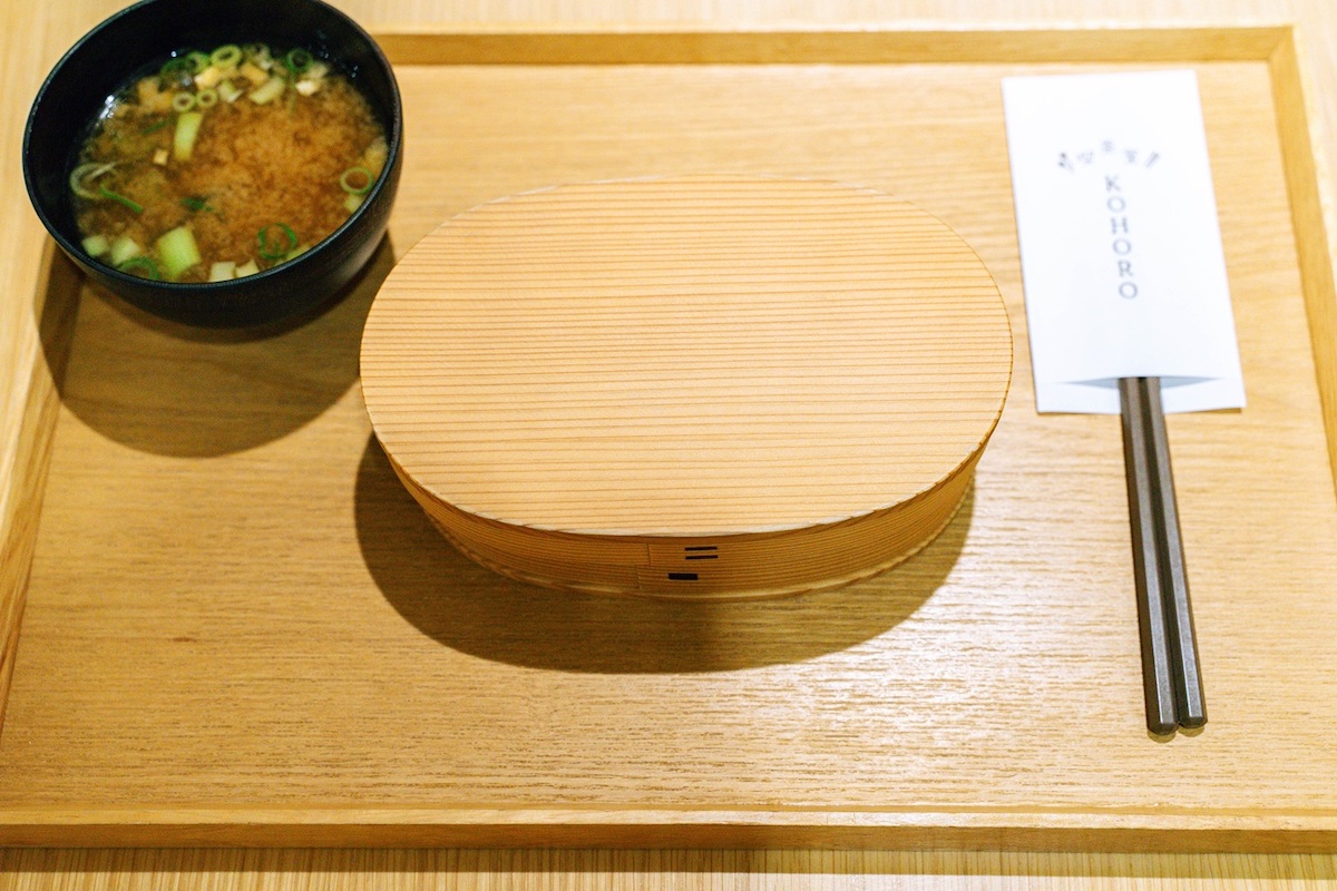 薄い木の板で仕立てられた工芸品、曲げわっぱひとつと、自家製のお味噌汁がお盆にのって提供されます。