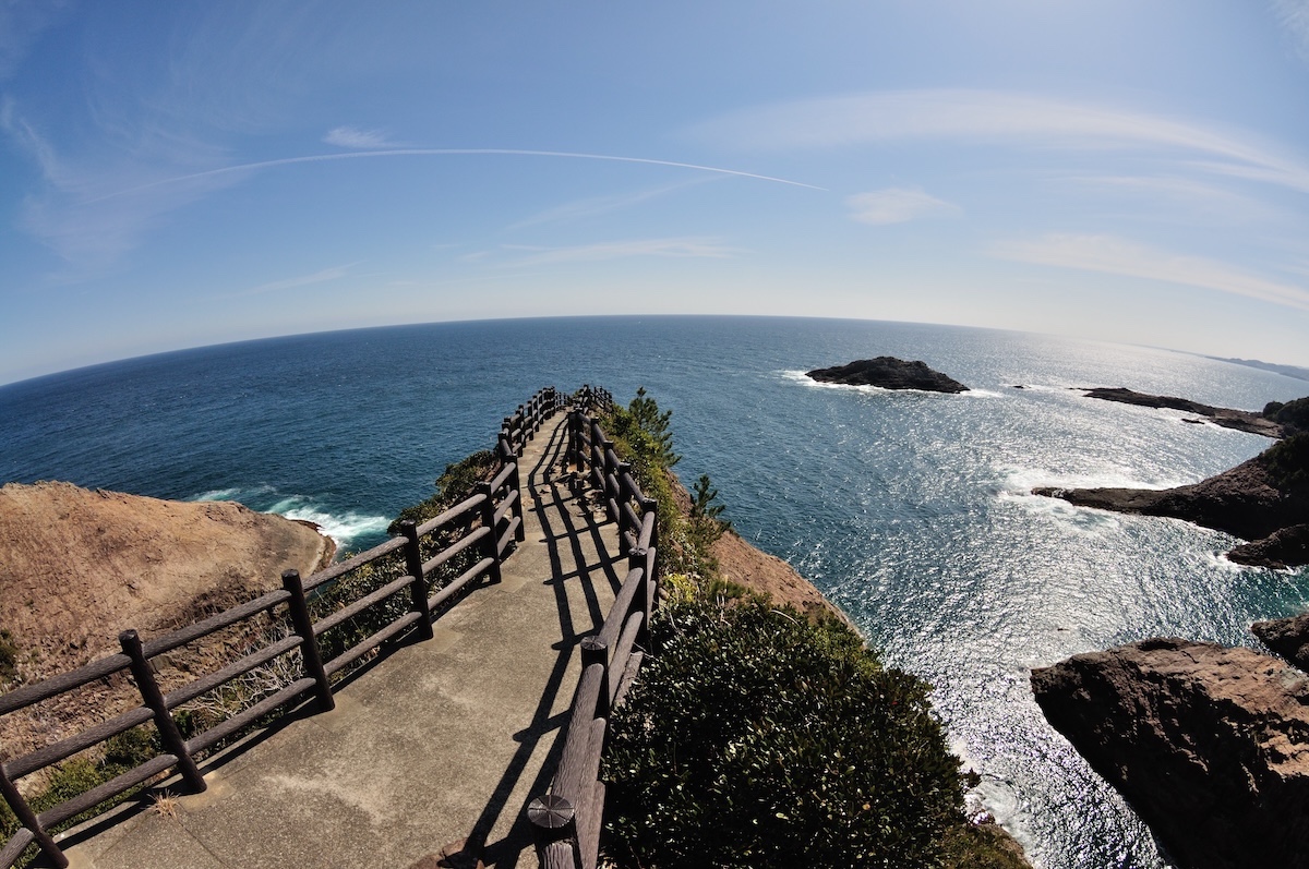 「馬ヶ背」の断崖絶壁の間には、幅10m、奥行200mほどの海水路ができていて、白い荒波が切り込んでくる豪快な景色が見られます。突端からは270度のパノラマの海が広がり、弧を描く美しい水平線が望めます。「日向岬の柱状節理」は国の天然記念物に指定されています。