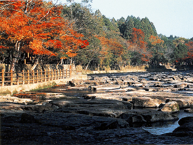 幅40m、高さ18mほどの大滝と、優雅に流れ落ちる男滝、女滝の3つからなり、「日本の滝100選」のひとつにも選ばれている「関之尾滝(せきのおのたき)」。滝の上流には世界有数規模の甌穴(おうけつ:水流が川底の石や岩石の破片を回転させてできる穴)群が広がり、国の天然記念物にも指定されています。雄大な自然がつくり出した、迷路のような甌穴の間をくぐる清らかな流れは一見の価値ありです。