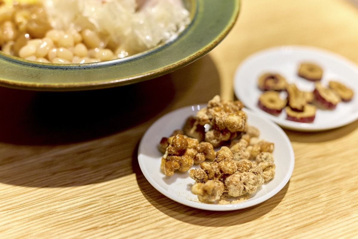食べやすくて、食後でもするっと入ります。冬はあたたかく、夏は冷たく。季節ごとに少しずつシロップの味も変わっていて、2025年の夏の豆花は黒文字ときび糖のシンプルなシロップ。黒文字はクスノキ科の落葉低木の一種。上品でさわやかな香りを添えます。フルーツは甘夏、ぶどうなど季節ごとに変わり、常に旬のおいしさを味わえます。