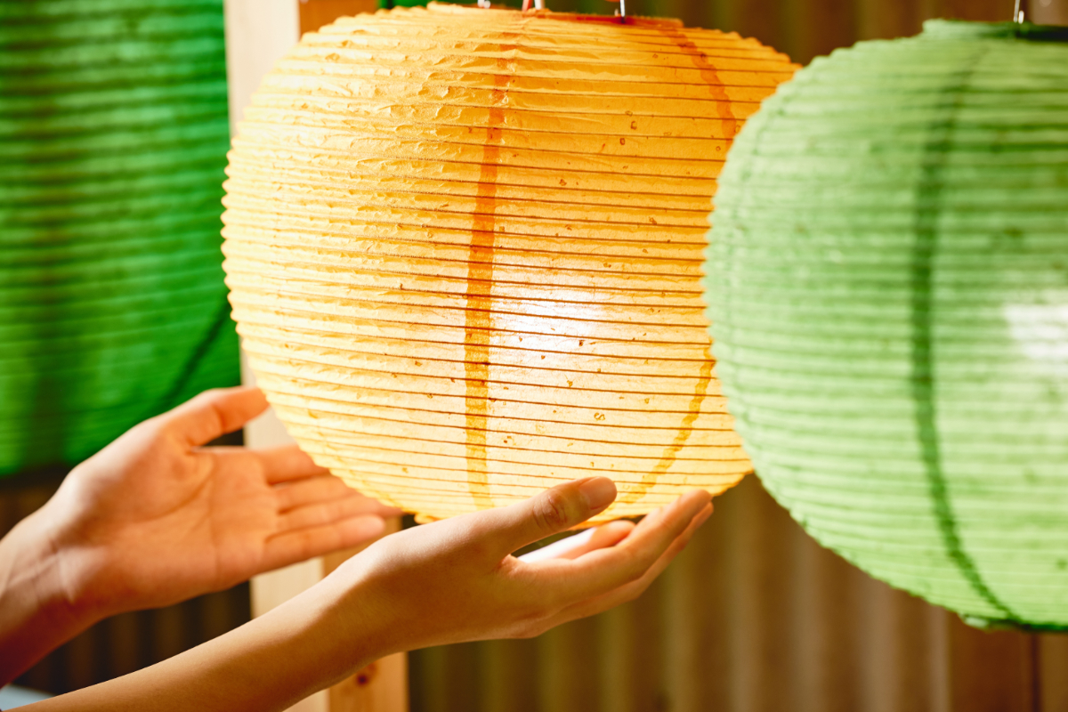 和紙にメロンの繊維が混じることで光がよりやわらかな風合いに。今年はミニサイズの提灯が連なったガーランド型のメロン提灯も登場し、空間を色鮮やかに照らしています。