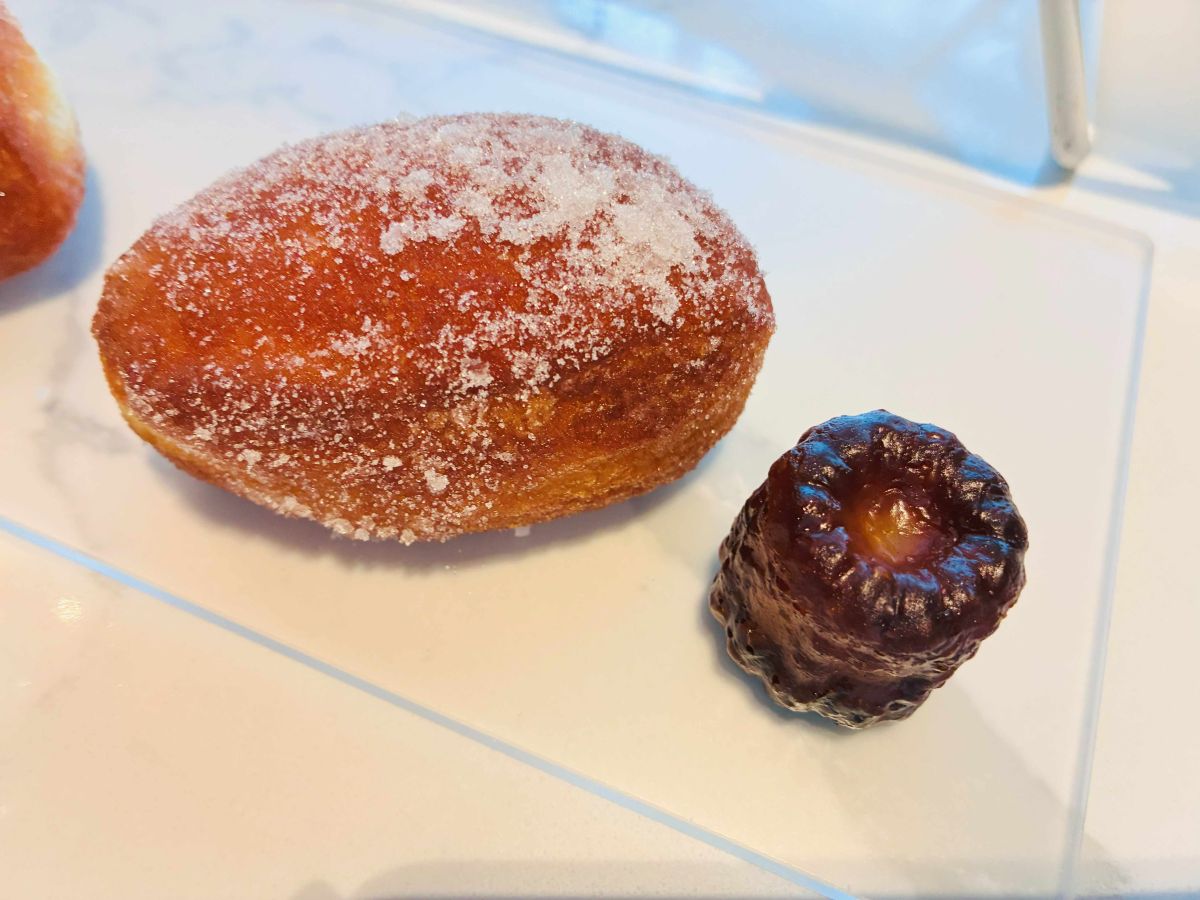 「カヌレ・ド・ボルドー」(写真右)は、一口ぐらいの控えめサイズながらも、もっちりむっちりの重厚な食感で満足感の高い一品。時折感じる芳醇なラム酒の香りとオトナな余韻に心が落ち着きます…。
