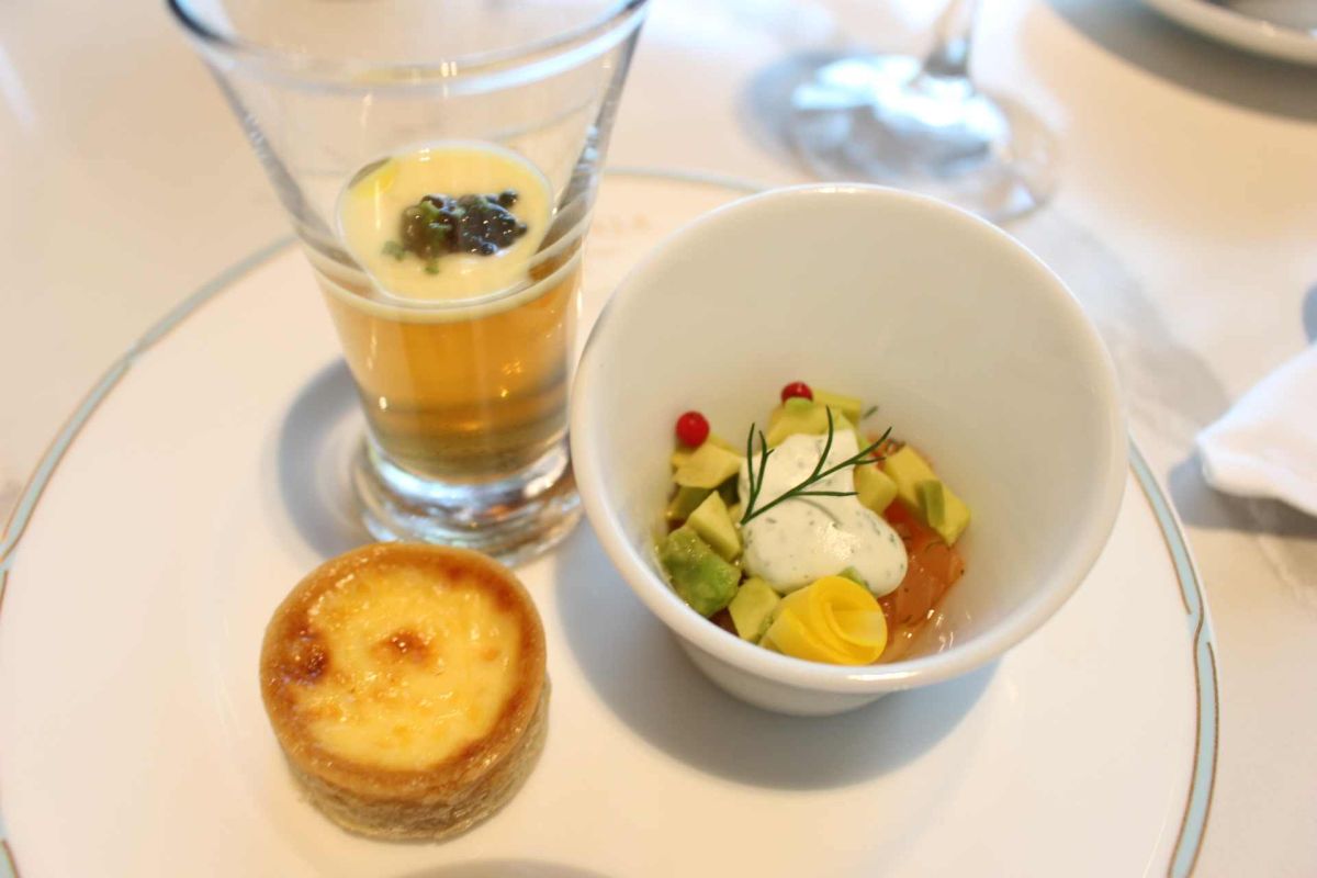 「コンソメジュレとマイスのヴルーテ キャビアリ キャビアとフレーバーオイル」(写真左上)は、コンソメスープととうもろこしのジュレの上にキャビアをオン…!スープは一口味わうとさっぱりとした印象ですが、後々スパイシーなうま味も感じられます。