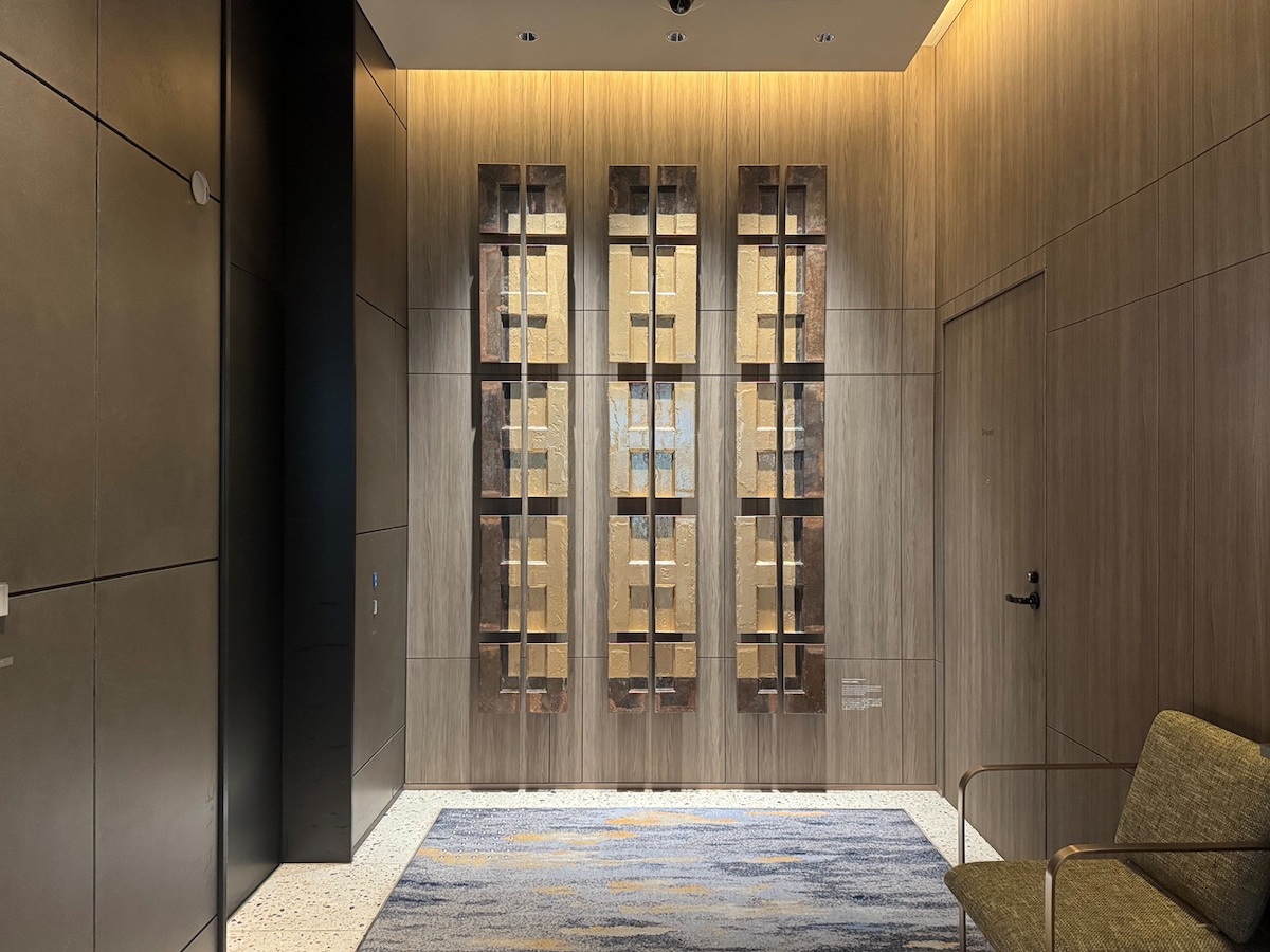 1階エレベーターホールには、旧京町ビルの鋼鉄扉を再利用したオブジェを展示。重厚感たっぷりの扉が、訪れたゲストを出迎えるアート作品に生まれ変わっています。