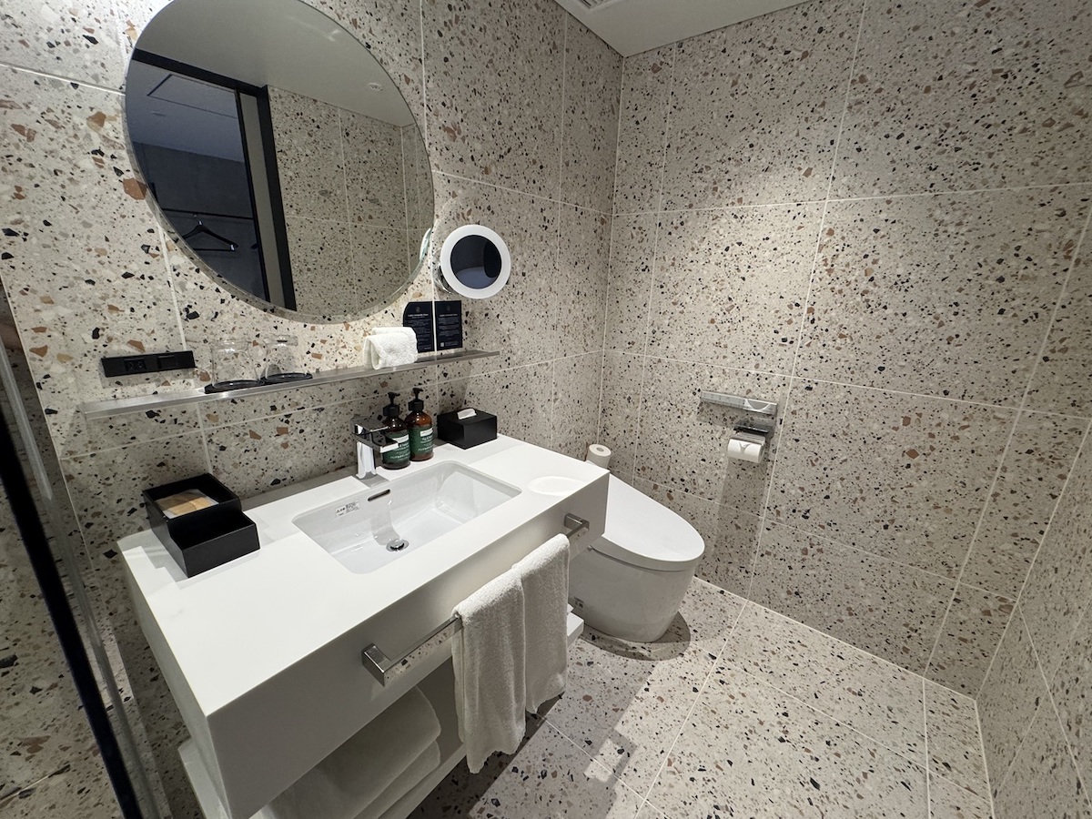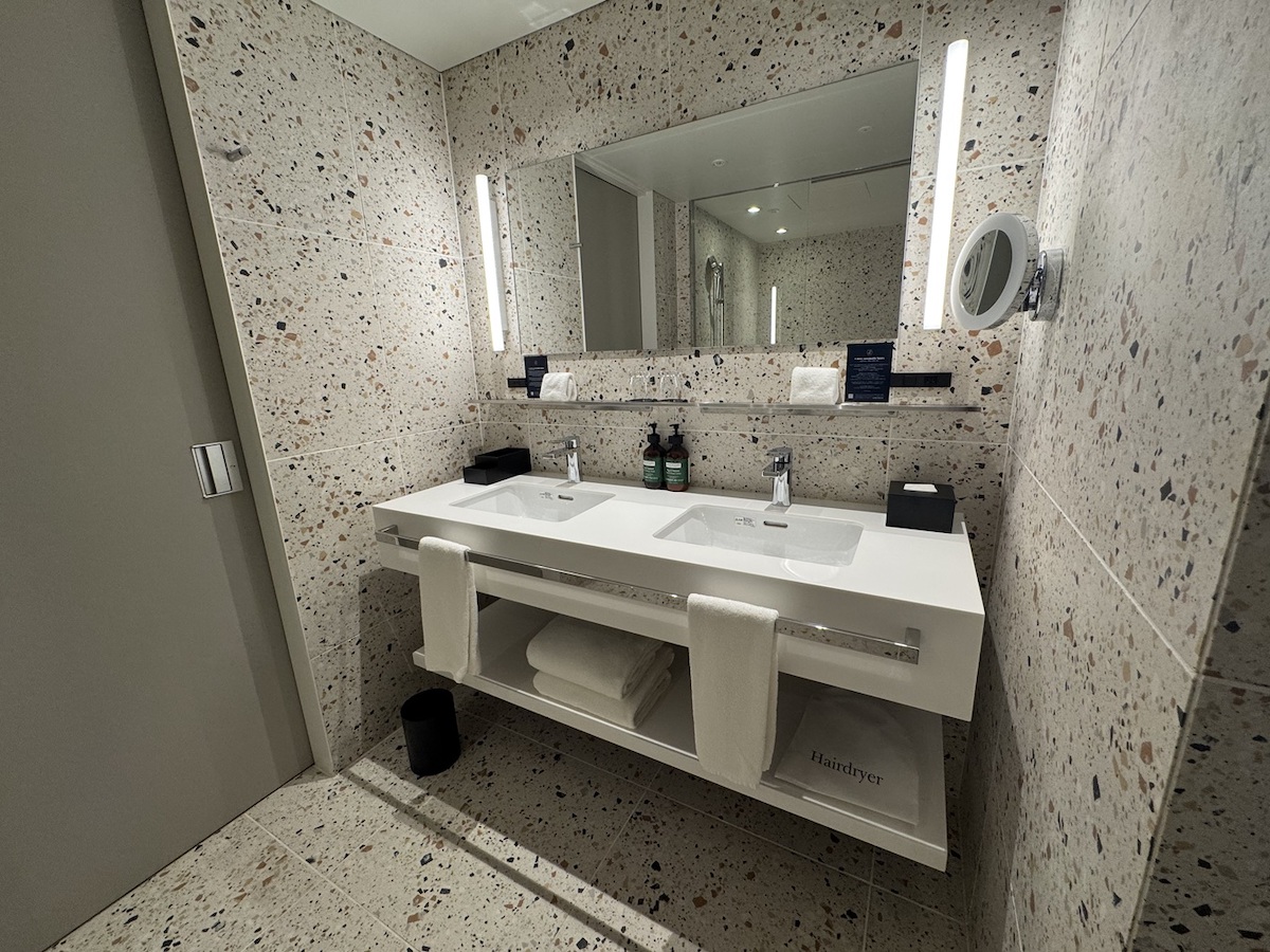 こちらの客室の特徴は、ダブルシンクの洗面台。おでかけの際、2人同時に身支度ができる点は、特に女性に喜ばれているのだとか。
