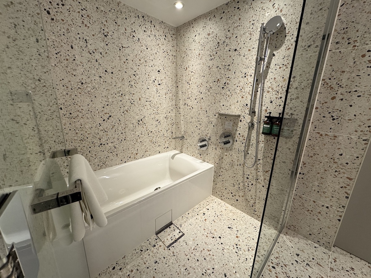 大人が足を伸ばせるくらいの広々としたお風呂も完備。環境に配慮した取り組みの一環で、節水タイプのエアレッドヘッドシャワーが備え付けられています。