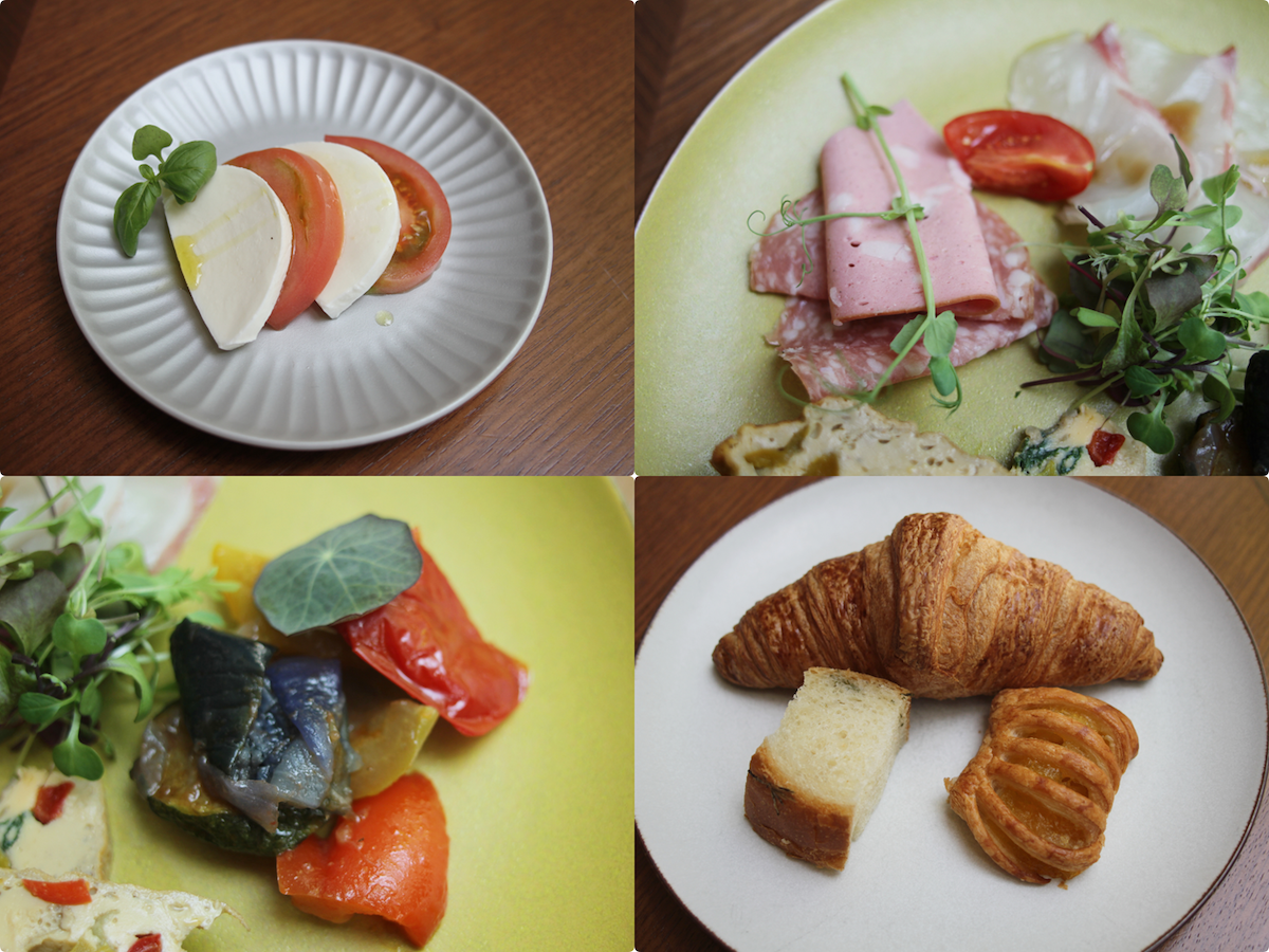 取材日の6月には「アンティパスト&スイーツビュッフェ~イタリア サマー バケーション~」というテーマで、前菜8種と、自家製パン3種、スイーツ9種、スムージー2種などがラインナップ。旬の素材を使ったフリッタータや夏野菜のカポナータ、鮮魚のカルパッチョ、冷製トマト豆腐など、ホテルシェフ自慢の品々がずらりと並んでいて、どれを食べようかワクワクします。