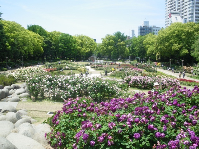 オフィス街にある都市公園。西約800m、南北約150mと細長く、春は桜、秋はケヤキ並木の紅葉が美しい公園です。東園と西園に分かれており、ホテルに近い東園には160種、約2600株のバラが植えられた約9000㎡のバラ園があります。
