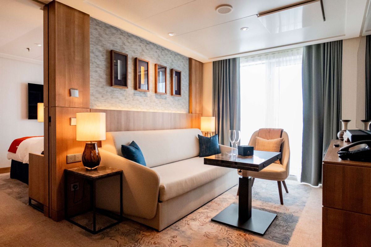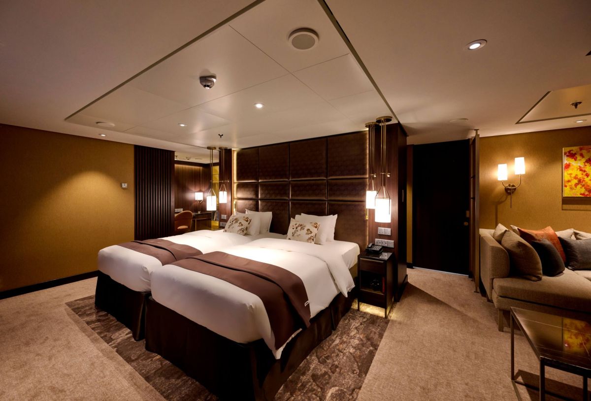「飛鳥Ⅲ」の2室だけの最上級客室。広さは114.8㎡、ベッドルームにリビング&ダイニングルーム、さらにはサンルームもある贅沢なつくり。バトラーサービスや特別なインクルーシブサービスが付き、各種予約も最優先。ステイタスと個性を兼ね備えたラグジュアリー空間です。